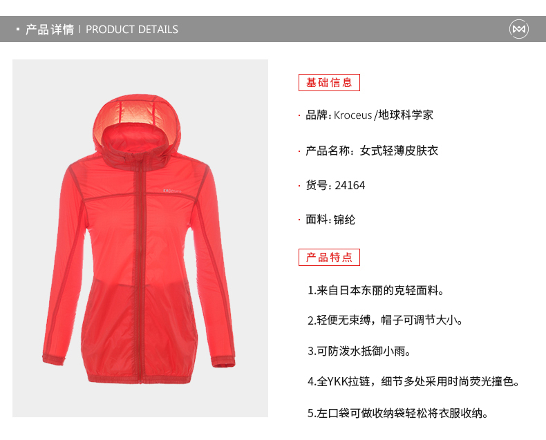 衣服采用收腰短风衣款式,荷叶式下摆,设计上更好看。左侧口袋是自收纳设计,可把皮肤风衣自收纳为很小的体积。后背是开孔透气设计,弹力松紧袖口和帽边,前胸和手臂带反光条,YKK拉链。同档面料皮肤风衣一般最低也要300元附近,低于200元是少有的好价。