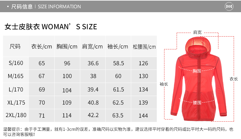 好的皮肤风衣近乎99%防风,适合春夏秋三季穿,春秋防风,夏季早晚御寒,白天防晒。皮肤风衣面料非常薄,一般男款仅重100克,女款可轻至50克,收起来只比手机大一点,可随身携带应付天气的突变。除了防风,皮肤风衣也要透气,能隔水防小雨,能防晒,重量要轻,款式也要好。