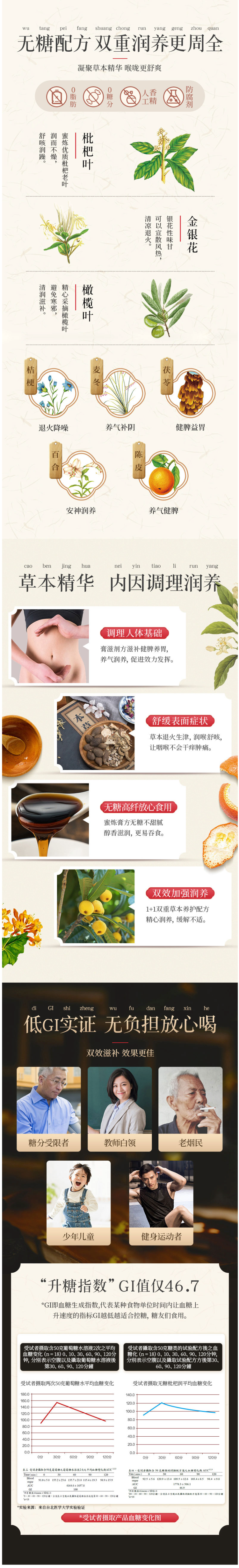 这款无糖枇杷膏 可以润肺止咳,清热退火。严选天然草本,不含防腐剂,无糖高纤,糖分摄入限制者也可放心食用,抗菌护喉,双效加强。里面还特别添加了金银花、橄榄叶,清凉降火。生活中,过度用嗓、环境影响、作息不规律、抽烟引起喉咙不适、饮食刺激、应酬多多,都会导致咽喉伤痕累累。