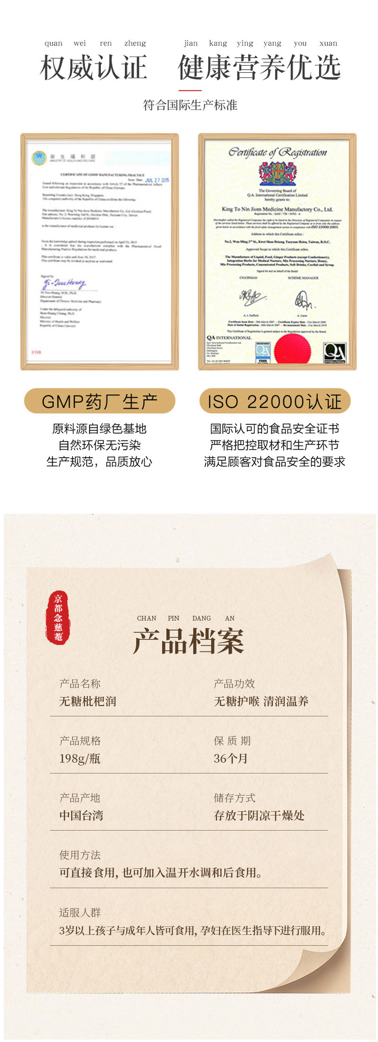 京都念慈菴蜜炼川贝枇杷膏是第一个荣获香港工业优质产品标志局所颁发优质标志的港制中药。此外澳洲TGA发出的GMP证书、加拿大卫生局发出的DlN证书以及台湾新厂的GMP认证,都标志着京都念慈菴的产品质量已经达到国际水准。产品行销全球20多个国家。