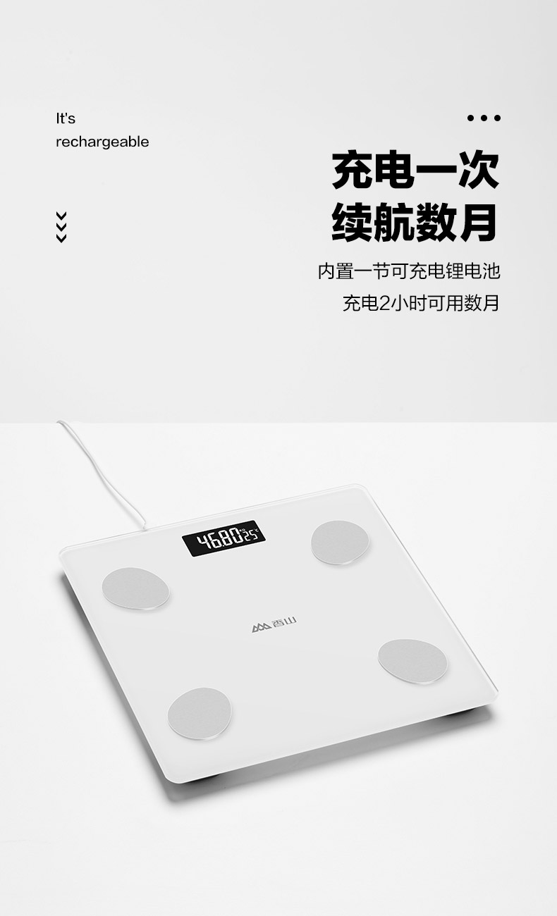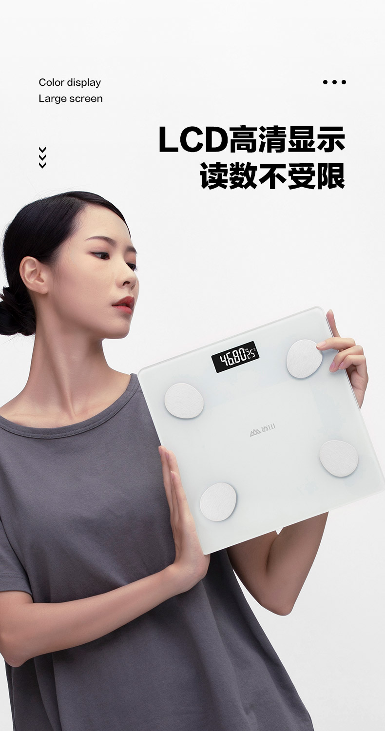 通过香山健康的APP的跟踪记录,可清楚明晰地了解到自己身体状况的变化,并且做出针对性调整。自动开关机,使用智能重力感应,上秤自动给开机,下秤自动关机。高硬度钢化玻璃表面,LED液晶显示,体重精确到0.1kg。尺寸29*26cm。