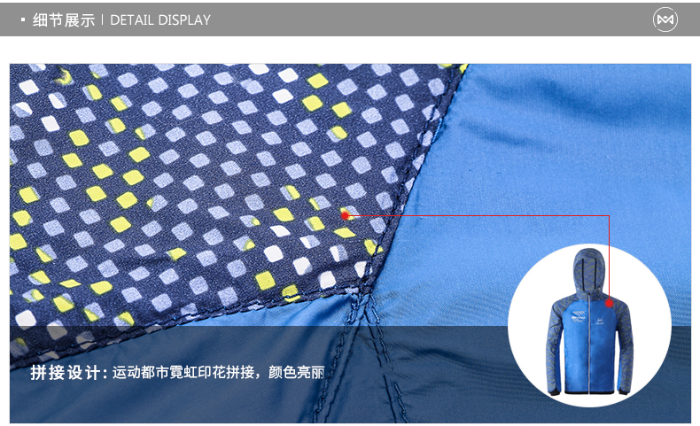 在款式上,一体连帽设计,腋下有专门的透气孔,弹力松紧袖口和下摆防止漏风,YKK拉链,衣面上是清晰鲜明的印花。