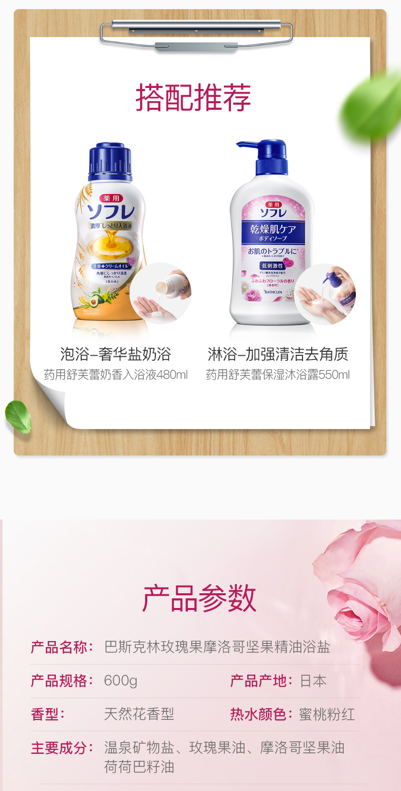 此款 玫瑰果美肌浴盐,日系粉色磨砂浴盐,精选温泉矿物细盐、珍珠提取物,还特别添加了玫瑰果油、摩洛哥坚果油、荷荷巴油,可深入补充肌肤所需营养,轻柔磨砂,能去角质,去鸡皮,祛痘!美白滋养保湿,皮肤滑溜溜,还可缓解情绪,放松身心。规格:600g 约可用30次。