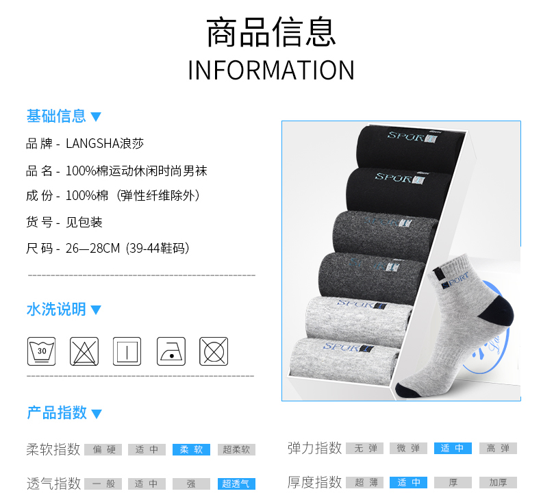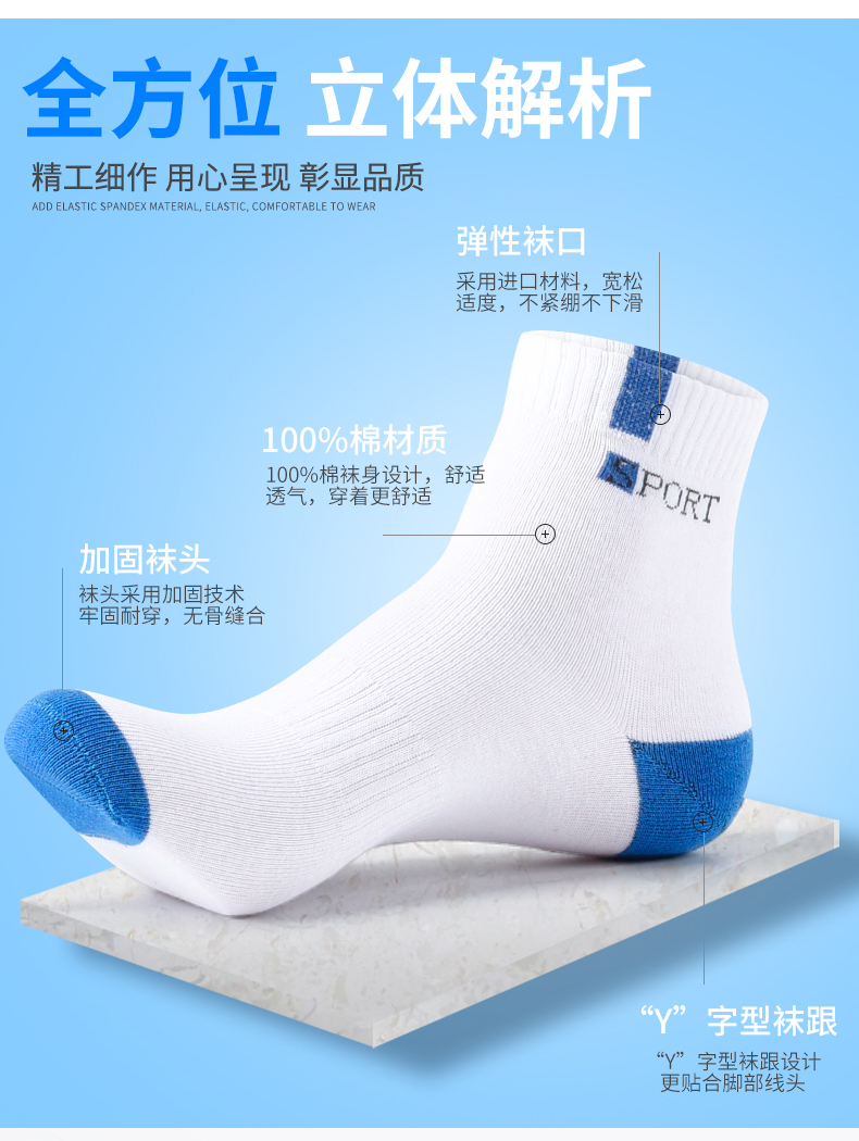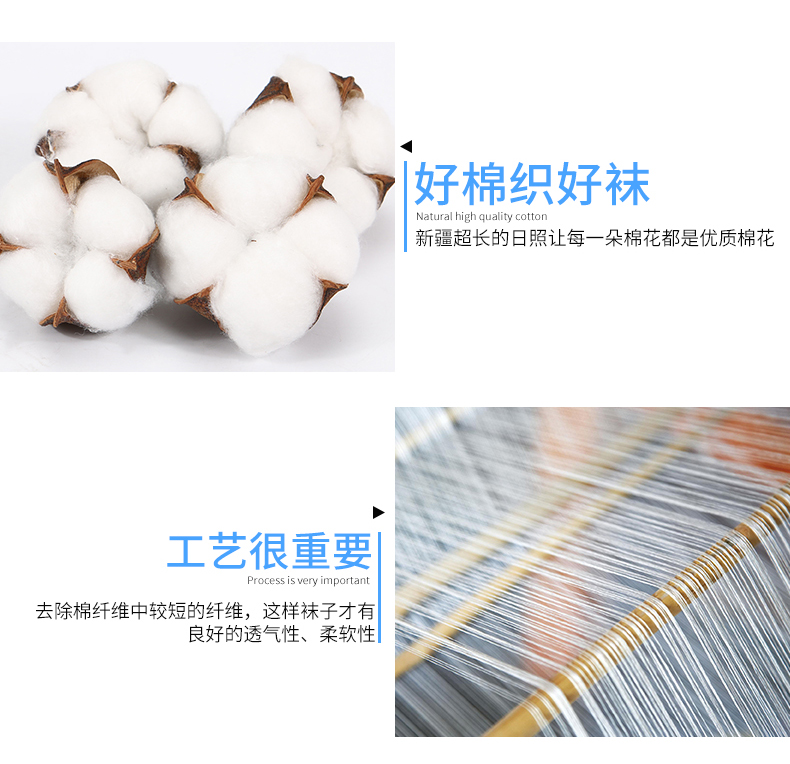 罗纹弹力袜口,进口材料制作,舒适高弹不勒脚,袜头采用加固技术,无骨缝合,牢固耐穿;根据人体工程学设计的防脱Y型袜跟,不易掉跟。