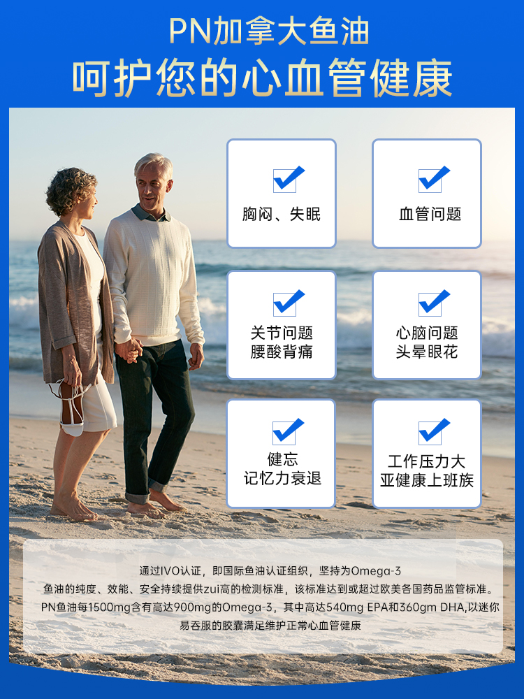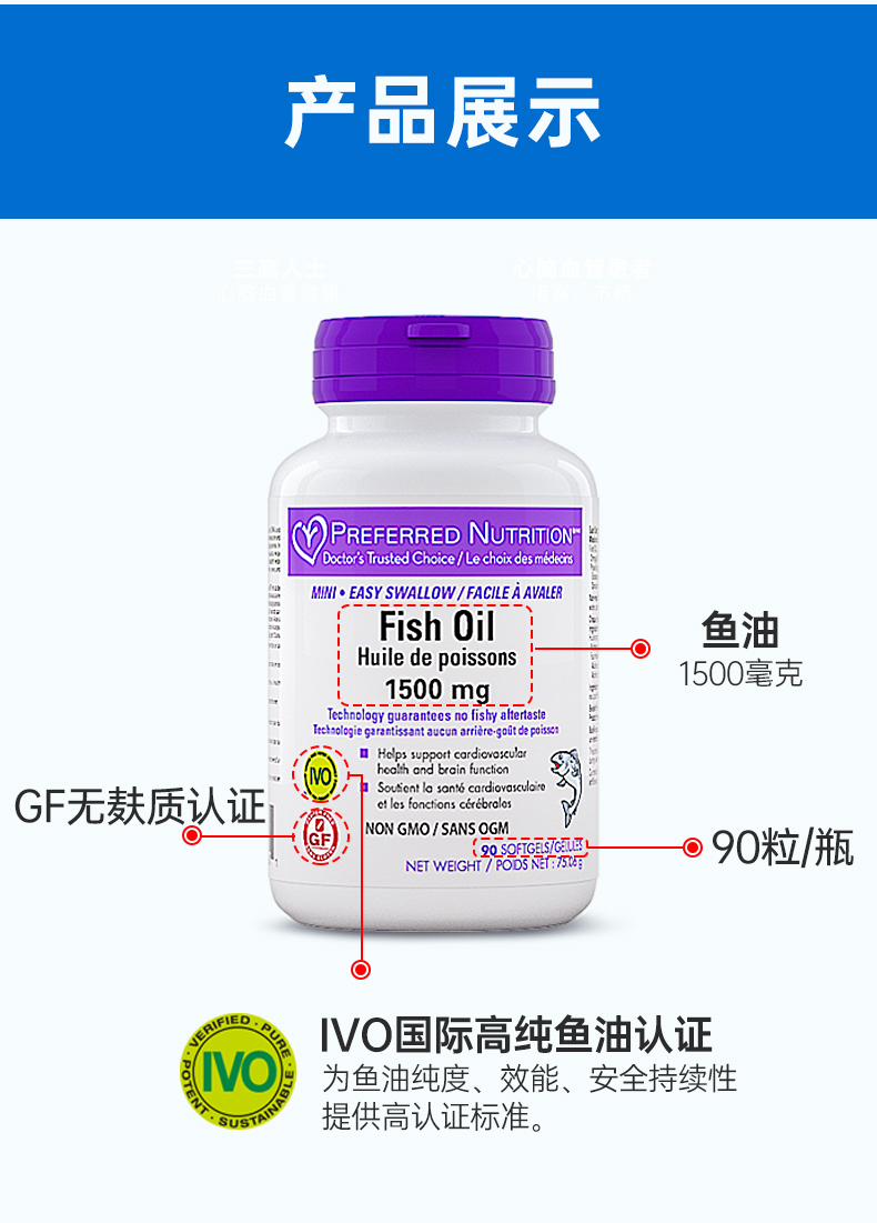 这款Preferred Nutrition深海鱼油软胶囊,加拿大进口,鱼油来源于加拿大纯净海域的野生小型深海鱼,浓度高、效果好,0污染,0重金属,含丰富的EPA及DHA不饱和脂肪酸,能在血液中迅速的被吸收,促进血液流通,减低血液在血管中的凝结及血管壁的黏附,从而有助于心脏和血管系统功能的正常运作,呵护心脑血管,预防三高。
