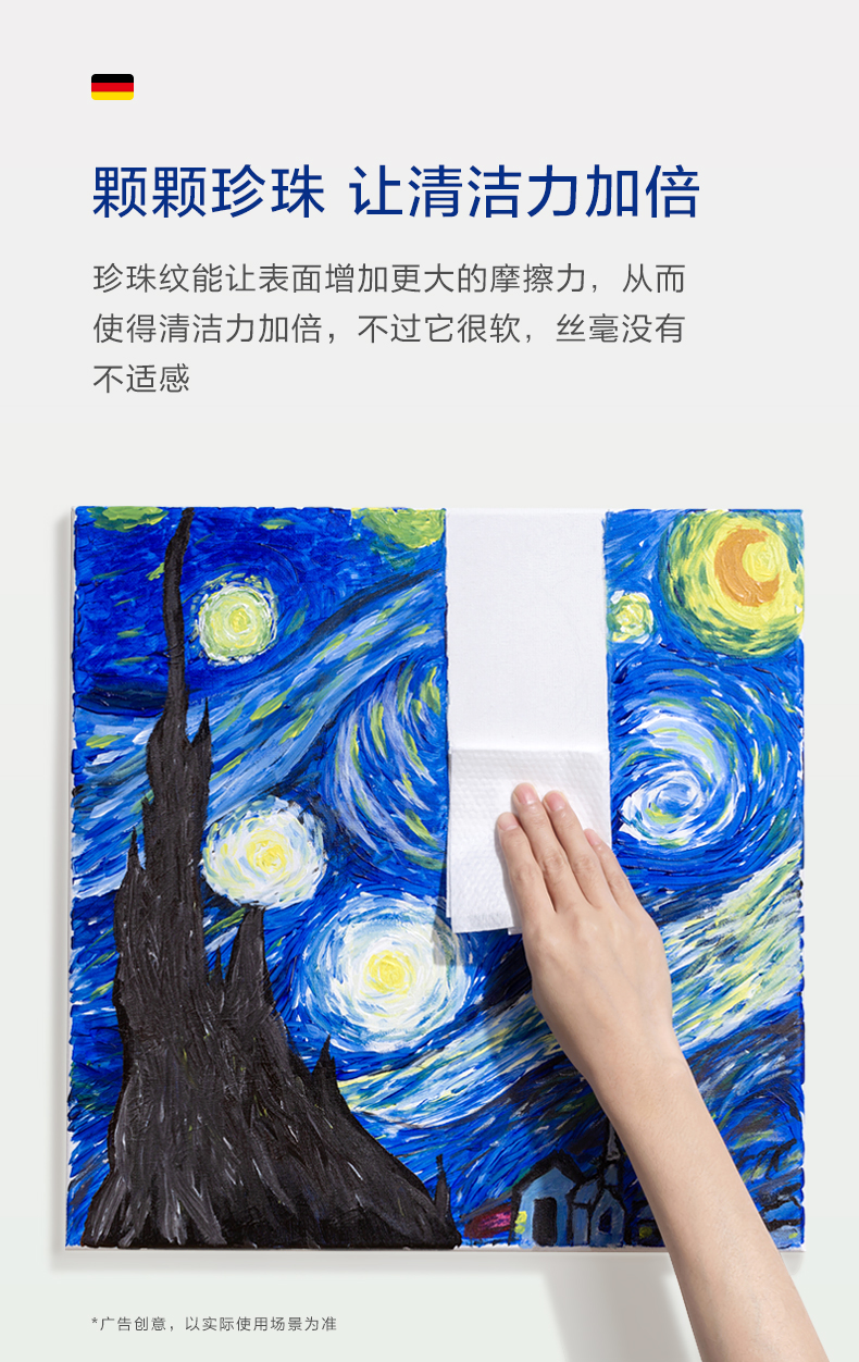 选用自然棉纤维,不含增白荧光剂,更温和,经高压水刺工艺,将纤维柔性缠结,更好的保留棉纤维中的细腻柔软,不易起球掉絮;棉纤维是交叉式排列,在保留柔软度的同时大大增加了韧性,沾水后耐撕扯不易破,尺寸是150*200mm,规格是100片/包。