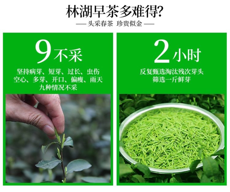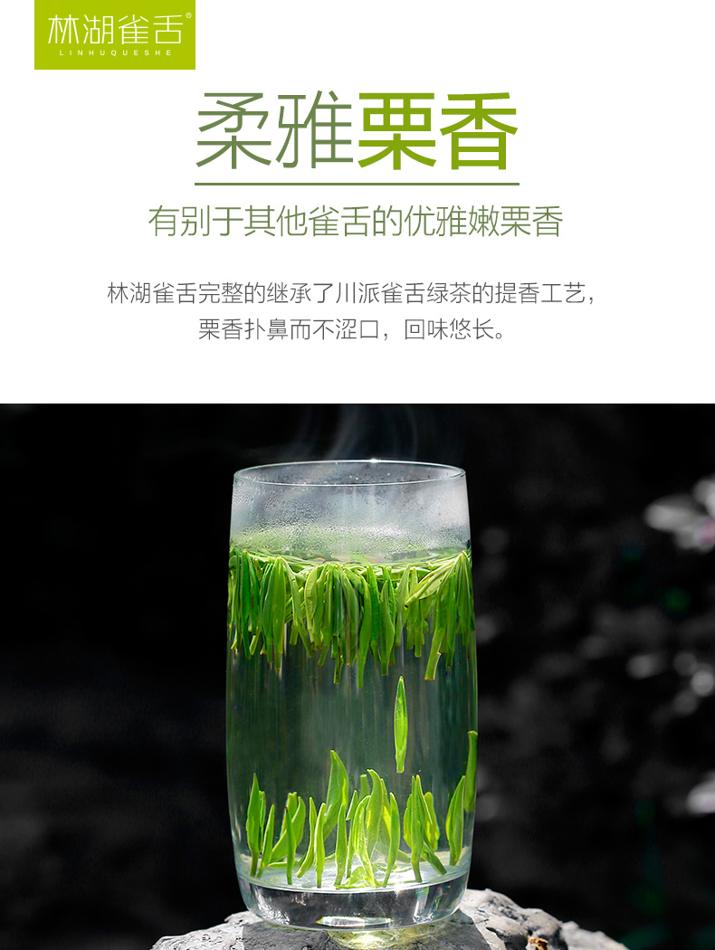 这款林湖雀舌,产自早茶之乡宜宾,明前特级春茶。采摘实心芽头,50000个以上芽头出1斤特级雀舌,每颗芽头都是颜值派。芽头细嫩,色脆香幽,味醇形美,口感醇厚,顺口清甜。