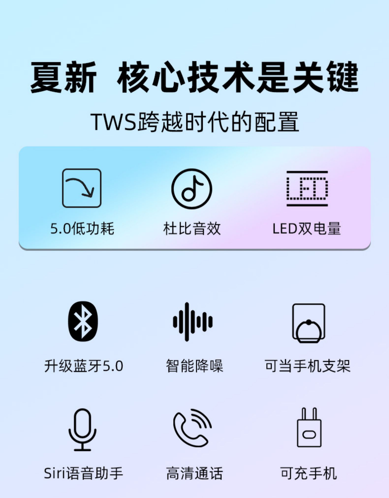 夏新大品牌,tws2蓝牙耳机,3色可选,超小迷你,入耳式,可无线蓝牙连接,二次自动闪速配对,5D环绕立体音效,配有充电仓(可给手机充电),持久续航280小时,机身IPX7级防水,运动外出也不怕。