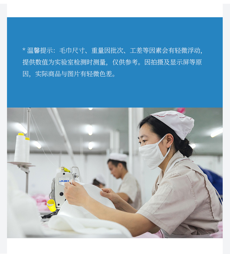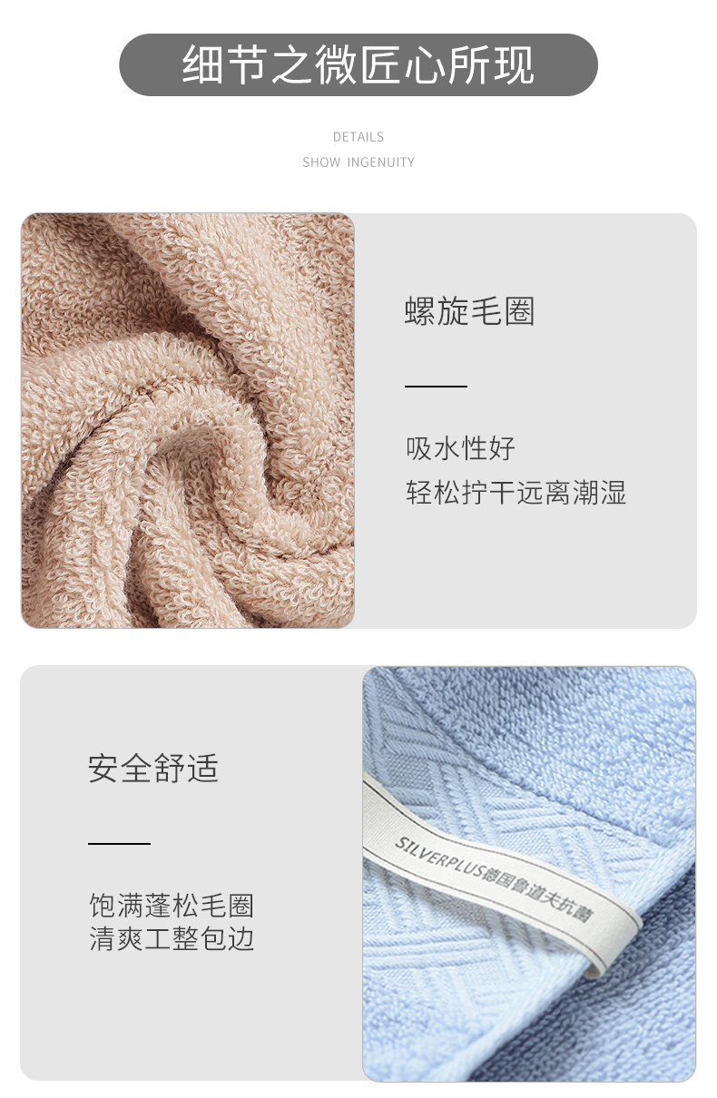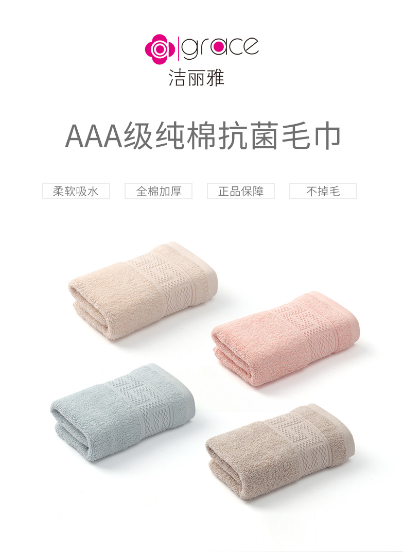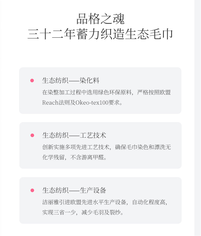 洁丽雅在中国长绒棉之乡和发源地新疆阿拉尔市建设现代生态化全产业链生产基地,品质好毛巾,采用原生好棉,100%新疆长绒棉材质,毛巾柔软蓬松,细腻亲肤,轻盈透气吸水性好,德国司马抑菌技术,减少细菌繁殖同时对人体皮肤自然菌群不产生影响,A类标准,无荧光剂,无甲醛、无芳香胺、无致敏源等,轻柔呵护,舒适安全。