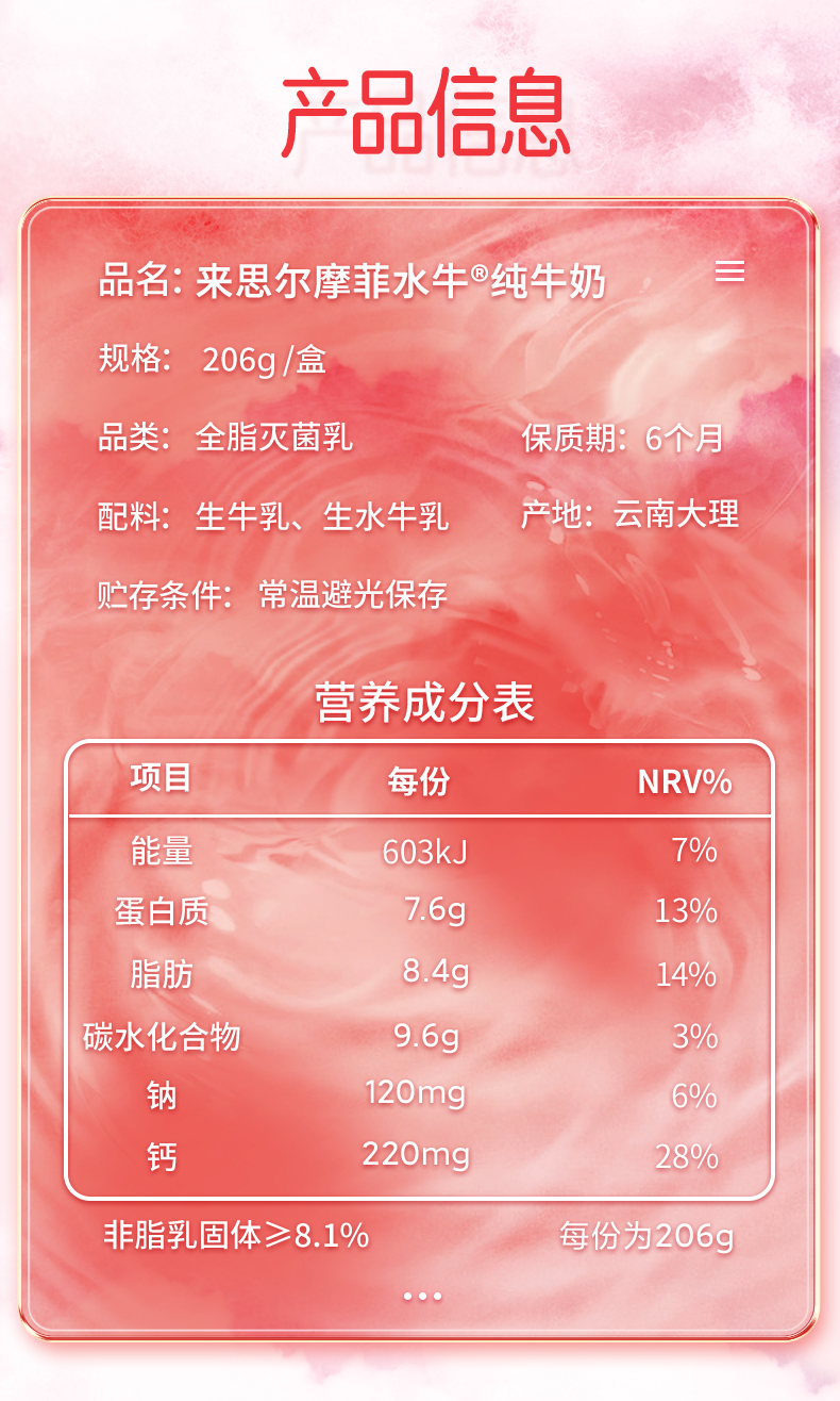 营养成分每盒206g 含:能量603kj 7%、蛋白质7.6g 13%、脂肪8.4g 14%、碳水化合物 9.6g 3%、钠120mg 6%、钙220mg 28%。