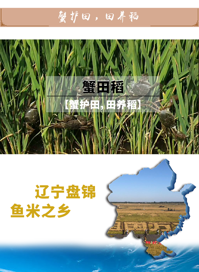 盘锦蟹田稻米,米稻田内既种稻又养蟹,形成了水稻护蟹,蟹吃虫饵,蟹粪肥田的天然食物链。所生大米粒大而圆,煮饭汁液晶莹剔透,细腻润滑,为稻米中之上乘。颗粒饱满,入口香甜。清新自然香味,口感软弹,米质精良。