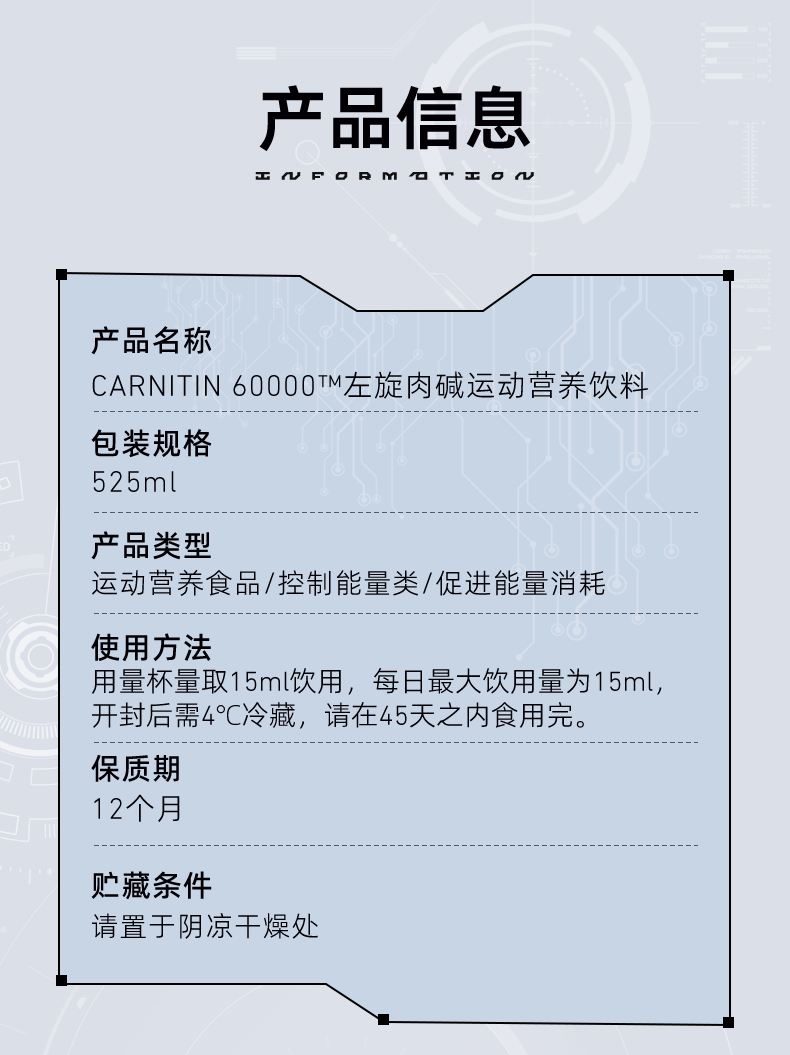 每10ml含有1200mg左旋肉碱,纯度高达99.99%,同时人体的吸收率也达99%,0糖分,0热量,0咖啡因。维生素B族协助脂肪在线粒体中分解燃烧;柑桔提取物能加速代谢,深层瓦解顽固部分,有效抑制食欲,预防能量过剩。