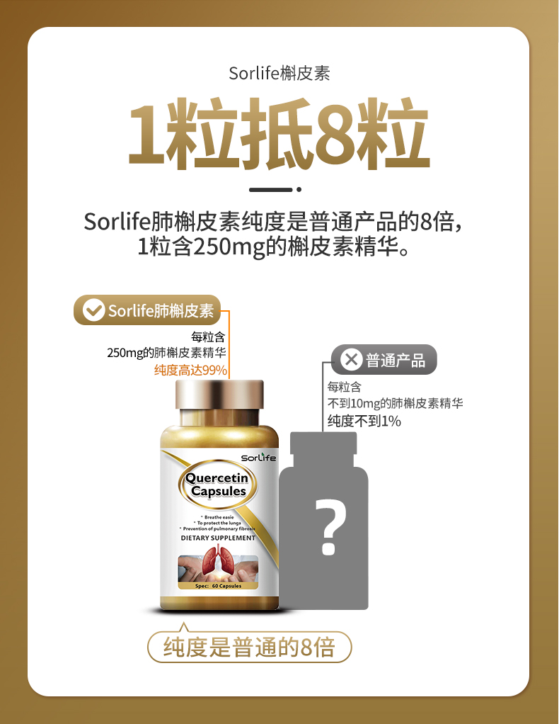 这款Sorlife 肺槲皮素健肺胶囊,规格:60粒,通过美国GPM+FDA双认证,天然植物萃取,超临界萃取工艺,每粒含250mg的槲皮素精华,纯度高达99%,适用于2~10mm更易吸收。每天一次,每次2粒。