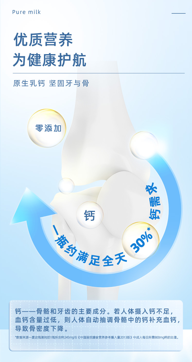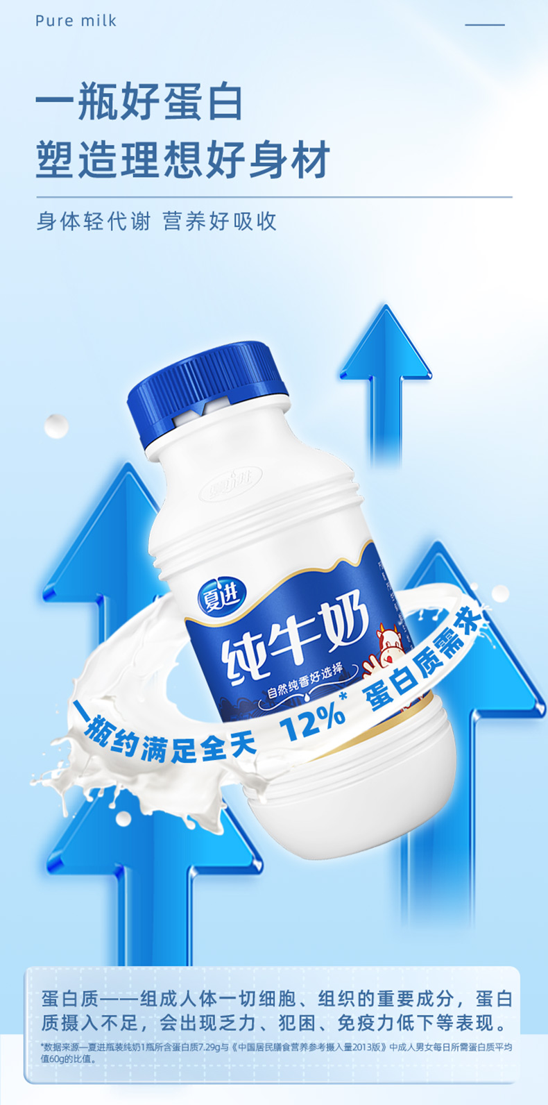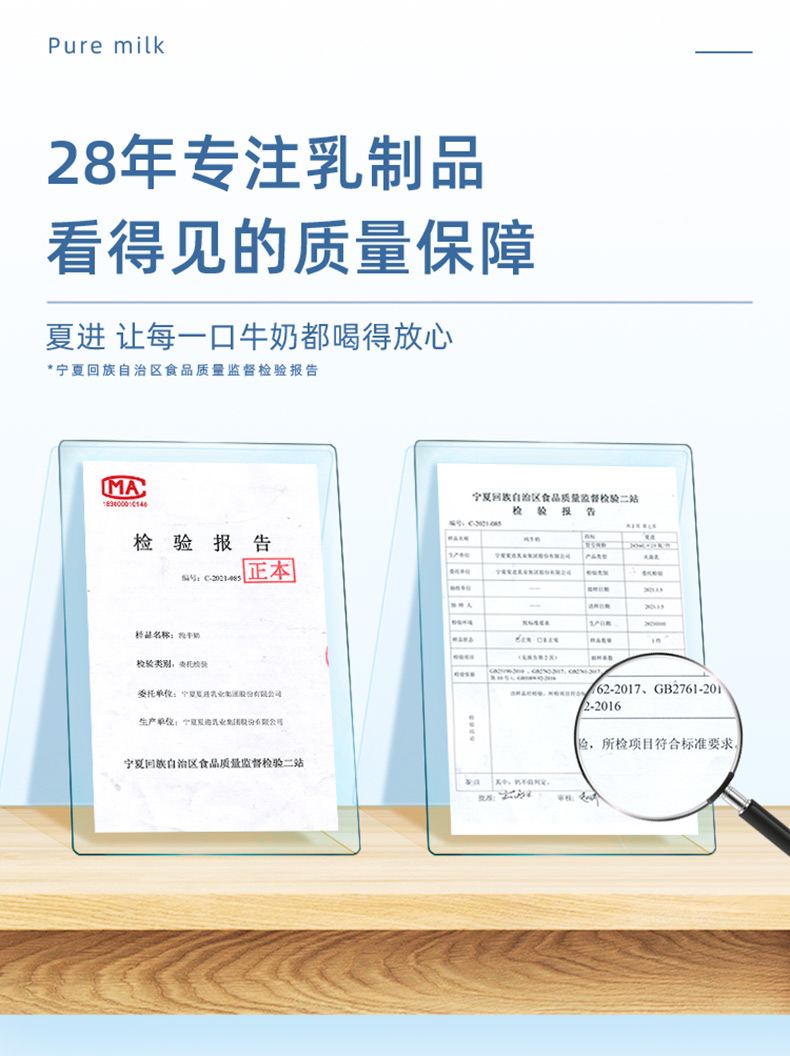 这款夏进 全脂纯牛奶,每100ml牛奶中含能量 260KJ(3%)、蛋白质 3g(5%)、脂肪 3.5g(6%)、碳水化合物 4.7g(2%)、 钠 55mg(3%)、钙 100mg(13%),牛奶营养指标丰富、口感香醇浓郁,采用欧盟标准检测,食用健康安全。