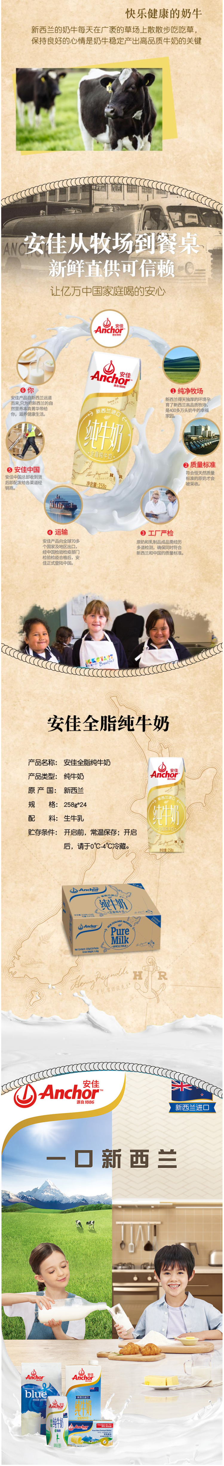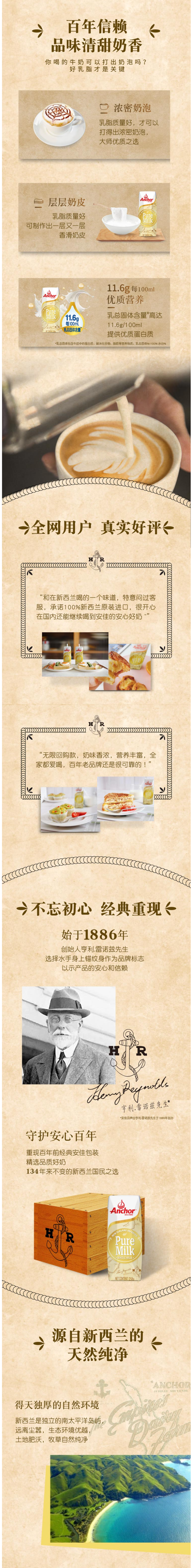 安佳Anchor是新西兰最大的乳制品生产公司Fonterra恒天然旗下品牌,新西兰国民之选,坚持天然草原放牧,环境近乎于纯净。而且对于乳制品,新西兰有专门的立法监管体系,所以安佳也是消费者最信任的牌子之一,也是是各大高端现磨咖啡制作奶泡的首选牛奶。