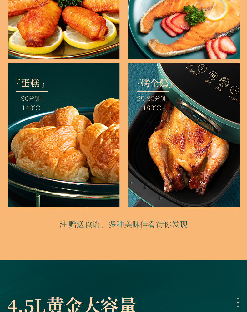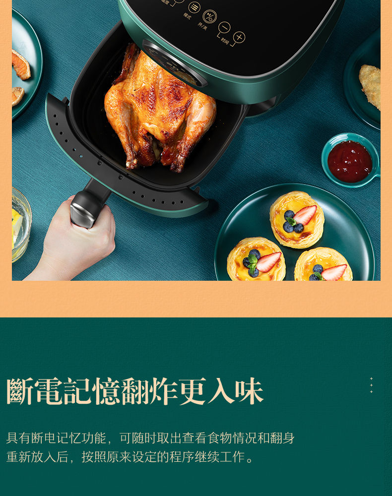 空气炸锅适合烹饪各种肉类、薯条、蛋挞(某宝上可直接买坯子 蛋液)。也可加热买来的外卖熟食,如 披萨、香肠、猪蹄、面包片类之类的,还是很方便的,也是厨房中实用比较高的厨具。