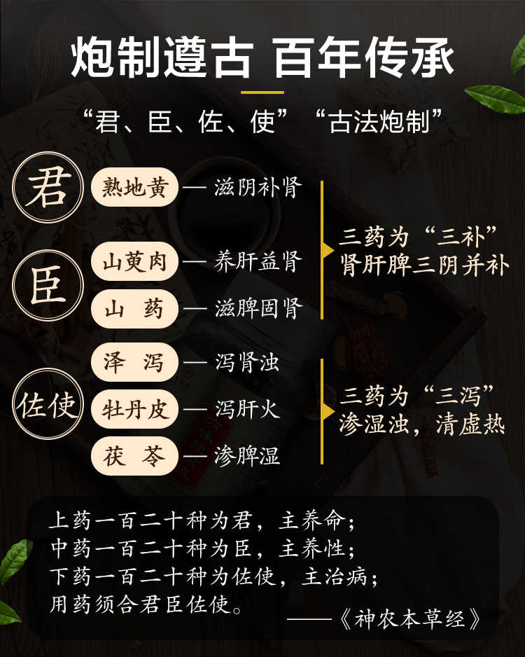 六味地黄丸具有滋阴补肾的功能,主治遗精盗汗、肾阴亏损、头晕耳鸣、骨蒸潮热、腰膝酸软等症状。由六味药材熬炼,先提取为浸膏,再炮制为药丸,使生物有效利用率更高,更易吸收,肠胃功能较弱的人也能服用。
