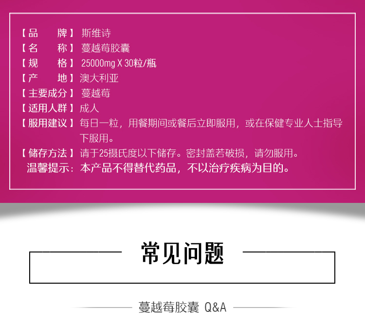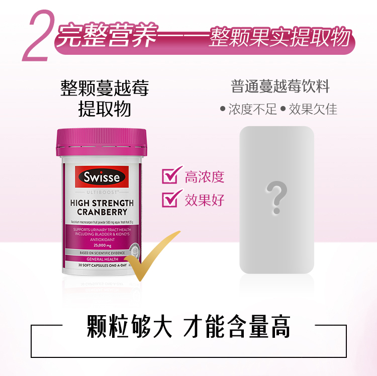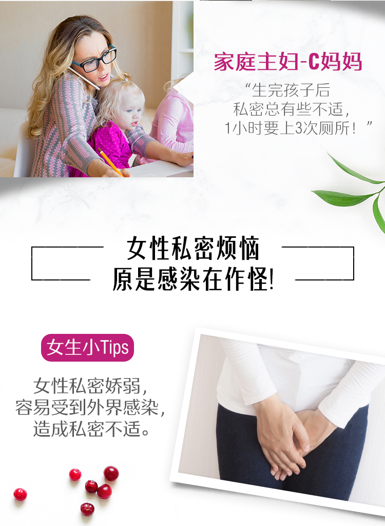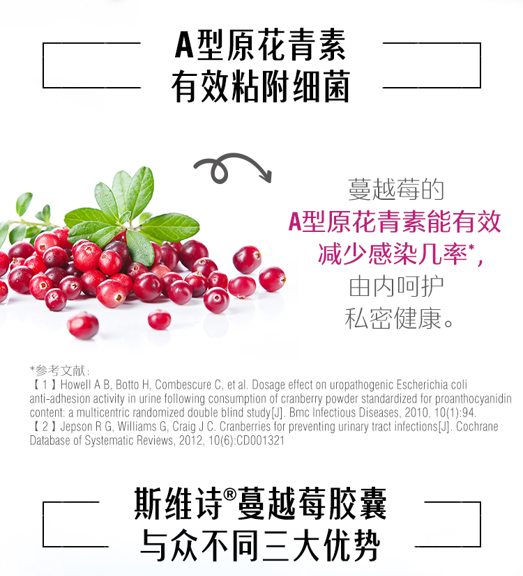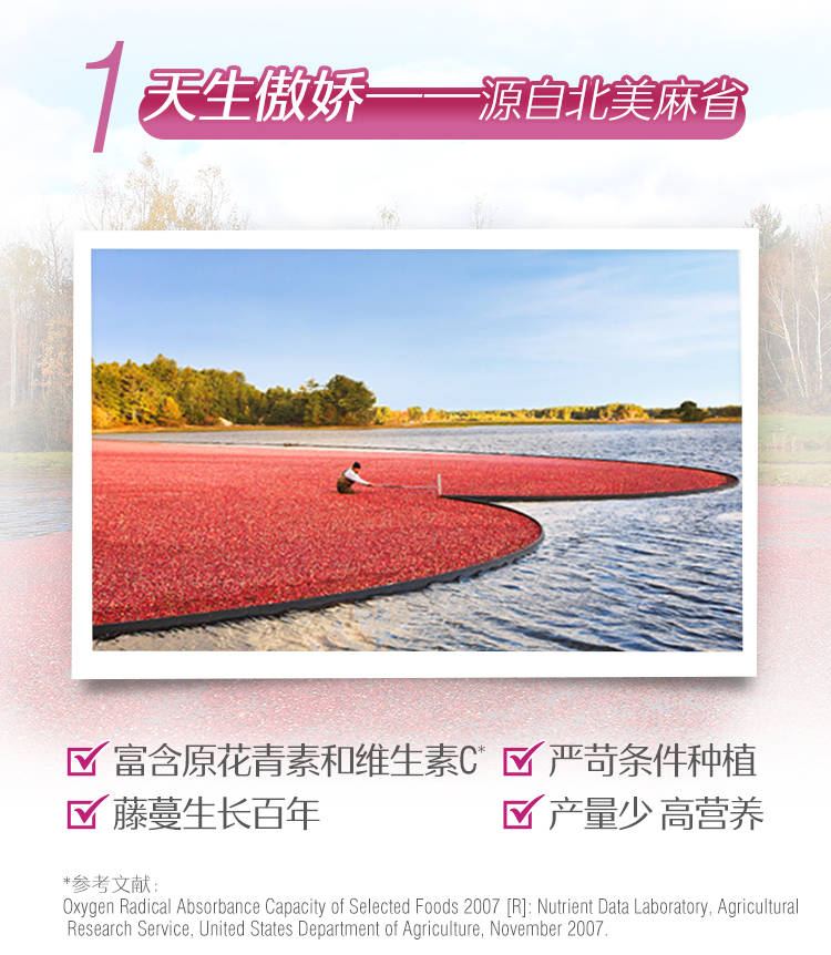 选用北美麻省纯蔓越莓果实未原料,这种蔓越莓需经过3-5年的栽培,才能长成,数量稀少;蔓越莓中的A型花青素,能够抑制杆菌粘附,提供源自肌体内的保护。除此之外,还有花青素、维生素C和类黄酮素。
