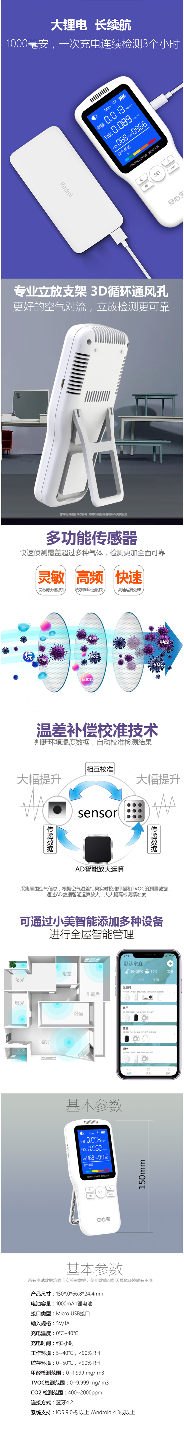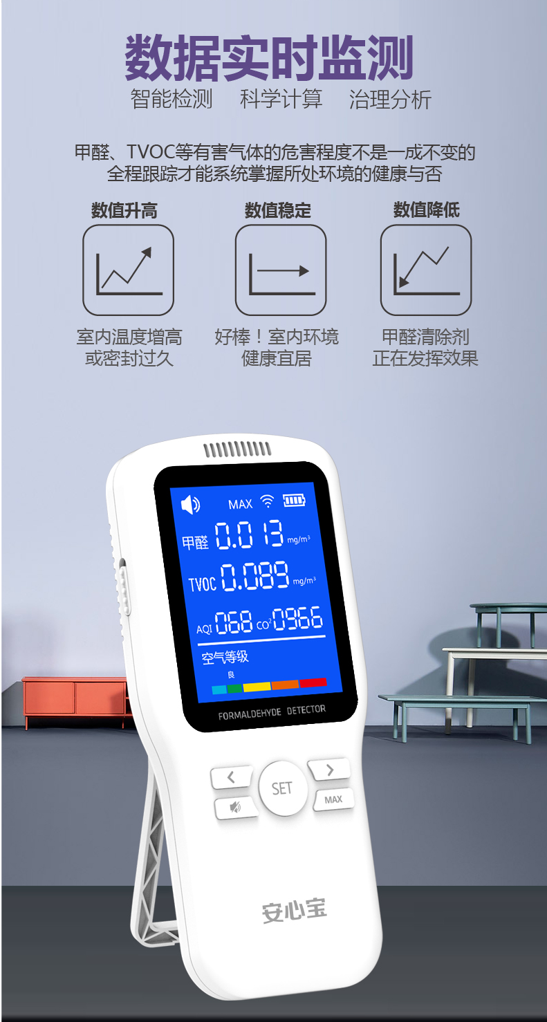 这款安心宝 甲醛检测仪,可测量甲醛、二氧化碳浓度、TVOC,能实时检测空气质量,通过与APP的连接,数据实时反馈到手机上,APP可长期记录,跟踪甲醛/TVOC等浓度趋势。