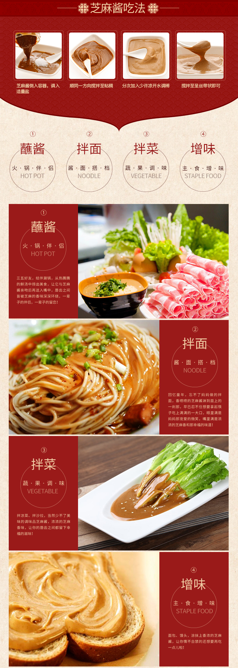 传统小磨工艺和国际先进超细碎技术,成品色泽清澈,持地细腻,香味浓郁,醇厚之久,适用于火锅蘸酱、馒头、面包、涂抹和凉拌菜调料。