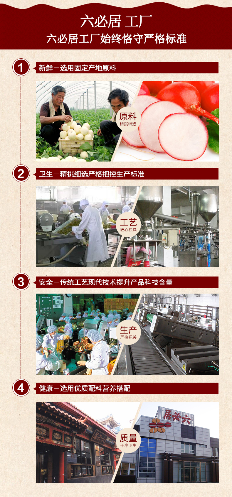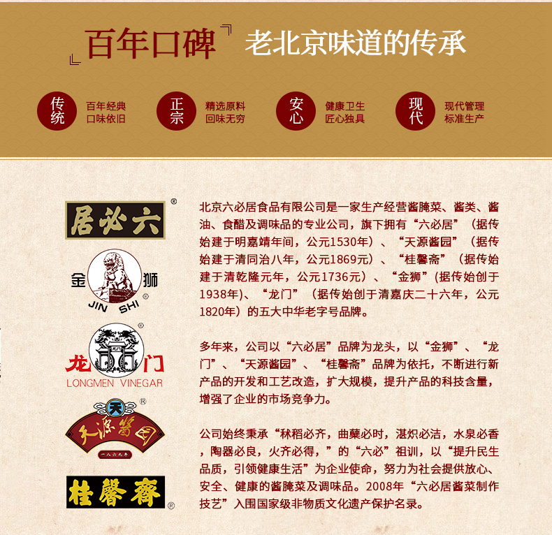 六必居酱园,始于明朝嘉靖九年(公元1530年),至今已有470余年的历史,是京城历史最悠久最负盛名的老字号之一。挂在六必居店内的金字大匾,相传是明朝大学士严嵩题写。六必居原是山西临汾西杜村人赵存仁、赵存义、赵存礼兄弟开办的小店铺,专卖柴米油盐。俗话说:“开门七件事:柴、米、油、盐、酱、醋、茶。”这七件是人们日常生活必不可少的。赵氏兄弟的小店铺,因为不卖茶,就起名六必居。