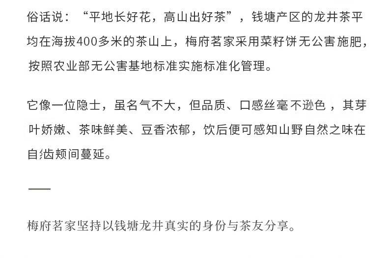天猫梅府茗家旗舰店119元,可领40元优惠券,实付79元到手,梅府茗家为杭州品道茶叶有限公司旗下核心品牌,公司在梅家坞、狮峰山设有原生态茶园、无公害基地。此款产地为钱塘产区,为雨前二级,干茶扁平光滑,色泽为绿黄色、豆香浓郁,滋味醇和鲜爽。