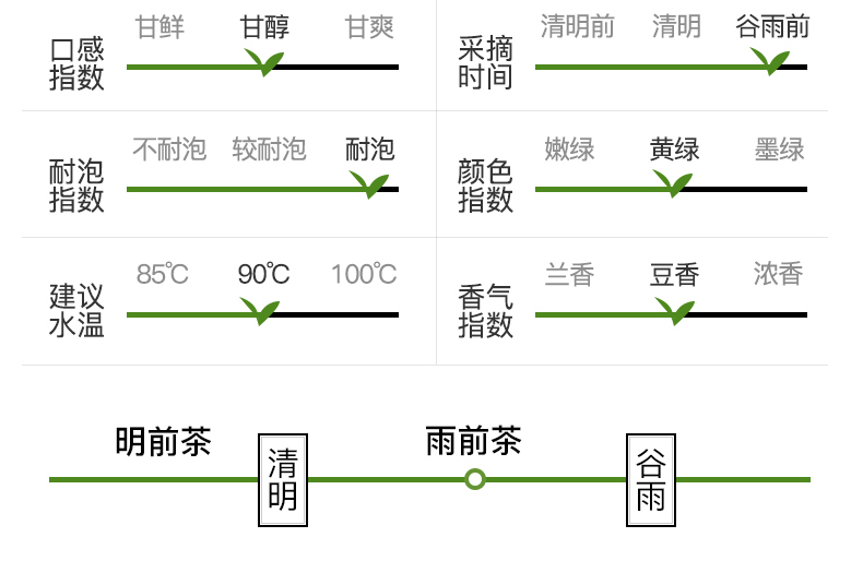 从等级高低来分,是糙米色(米黄色)-黄绿色-绿黄色-绿色-深绿色。西湖龙井并非越绿越好,一般谷雨茶基本上颜色都是绿多黄少的绿黄色。