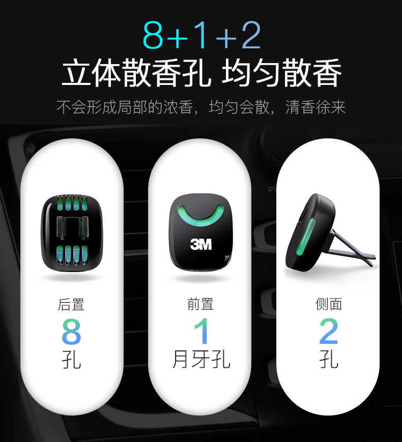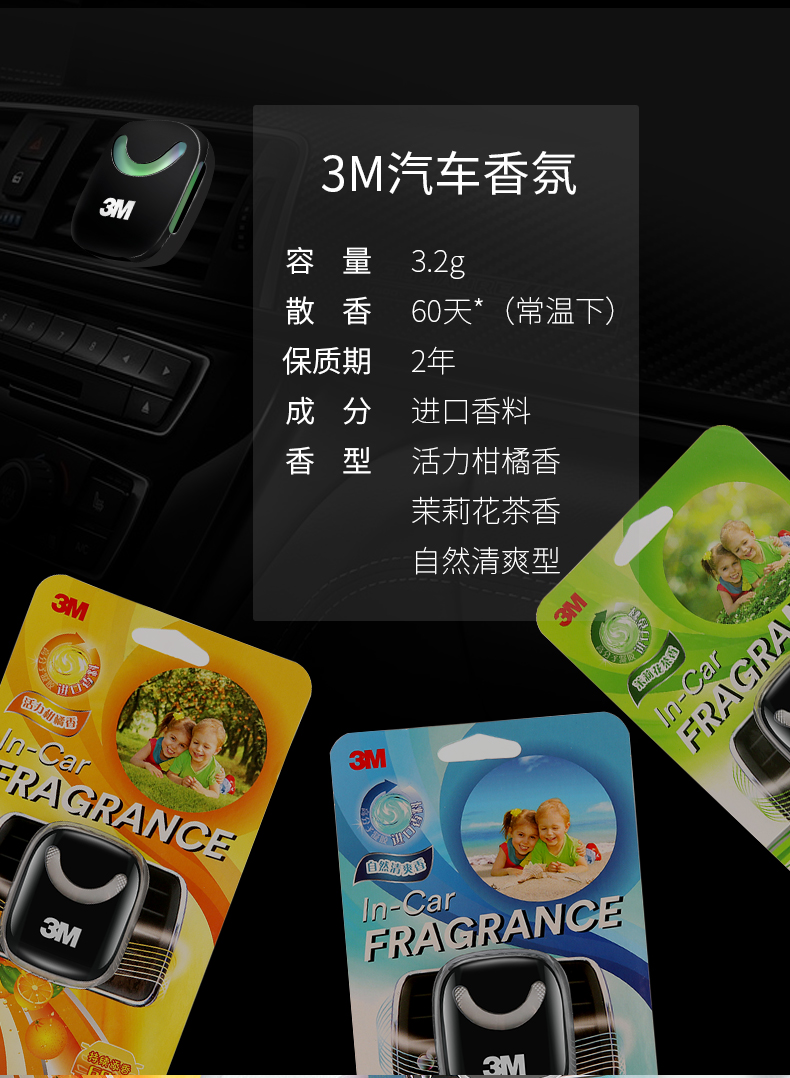 这款3M车载香水,使用起来非常方便,只需夹在空调的出风口处即可,内置美国进口香料,经过冷压法和蒸馏法,从甜橙、小苍兰、柠檬、薄荷等天然植物中萃取的精油,再经过特别配方调制而成,香味清新怡人,可祛除车内的异味、甲醛。