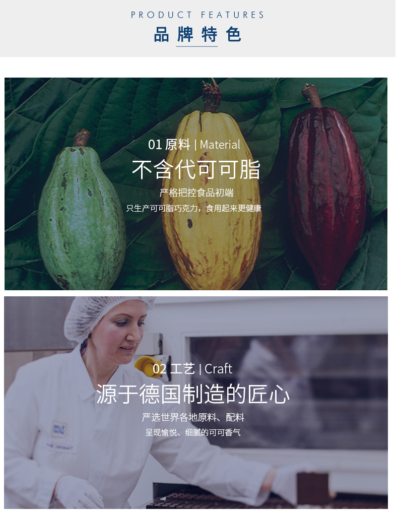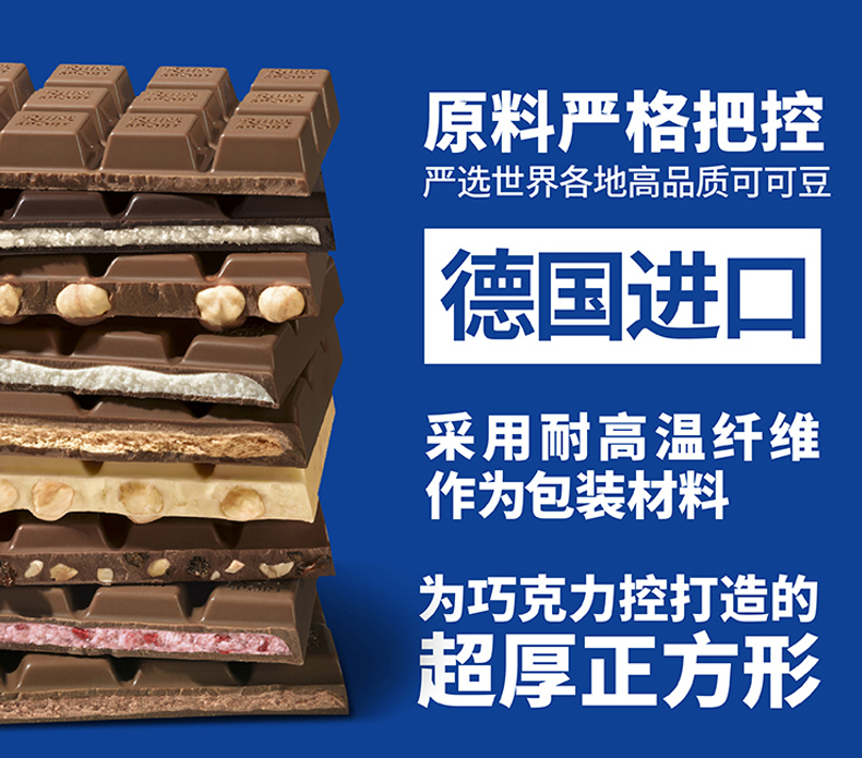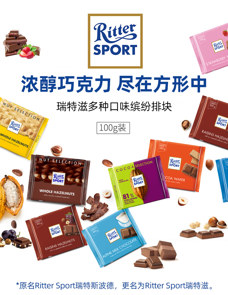 Ritter Sport在全球20大巧克力制造商中名列第四位。作为排块巧克力的创作者,Ritter Sport每种口味的巧克力都是用8种不同的可可混合而成,这款巧克力,口感丝滑浓郁香甜可口,甜而不燥,每一口都是满满的幸福。