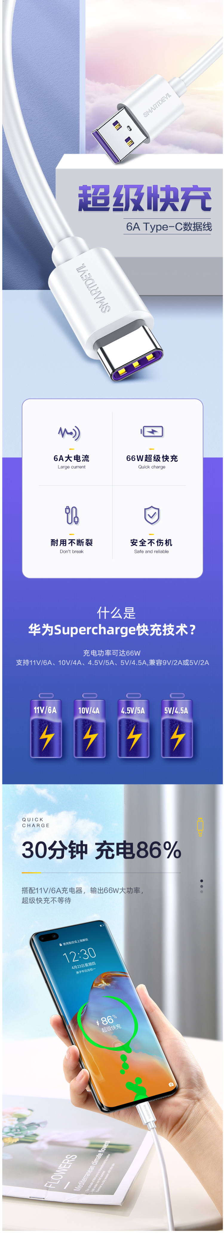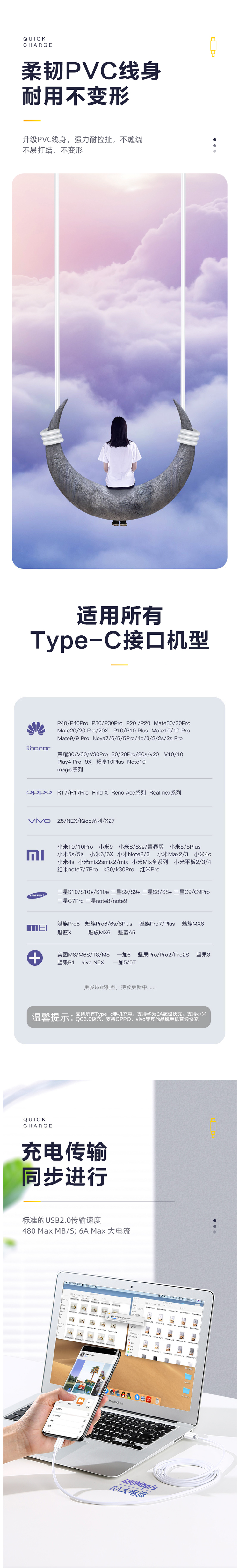 采用加粗镀锡铜线芯,充电传输二合一,正反都可插。支持小米系列高通QC3.0快充协议,并向下兼容QC2.0。内置电阻,稳定识别快充设备,涓流充电防止电流过载。升级PVC一体固线接头,告别接口破损开裂风险。