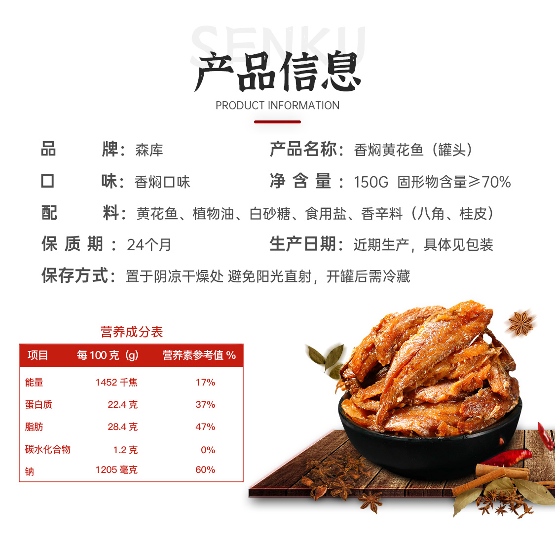 天猫森库旗舰店99元,可领45元优惠券,实付54元到手,10罐款此价。这里森库 香焖黄花鱼罐头 ,规格:150g*10罐。选用新鲜闽南海域黄鱼制成,鱼肉饱满,鱼骨酥烂,鱼香四溢,开罐即食。