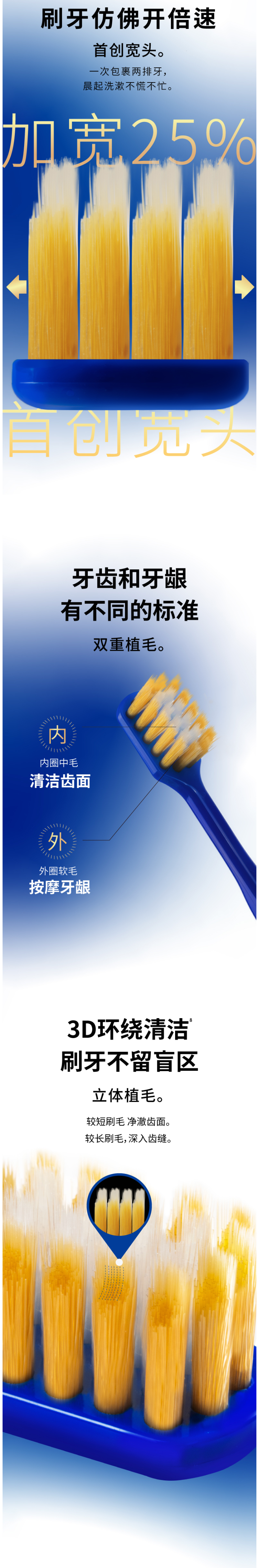 这款牙刷48孔大宽头设计,毛孔数是普通刷头的1.8倍,能大面积的覆盖上下牙齿和牙龈,双层不同柔软度的刷毛设计,柔与力兼施,清洁与按摩兼备,呵护娇嫩牙龈。同时也是平尖两种刷毛的组合,丝径20微米的「超纤细尖毛」,能深入清洁牙龈沟,「平切毛」能清洁齿面色渍和污垢。