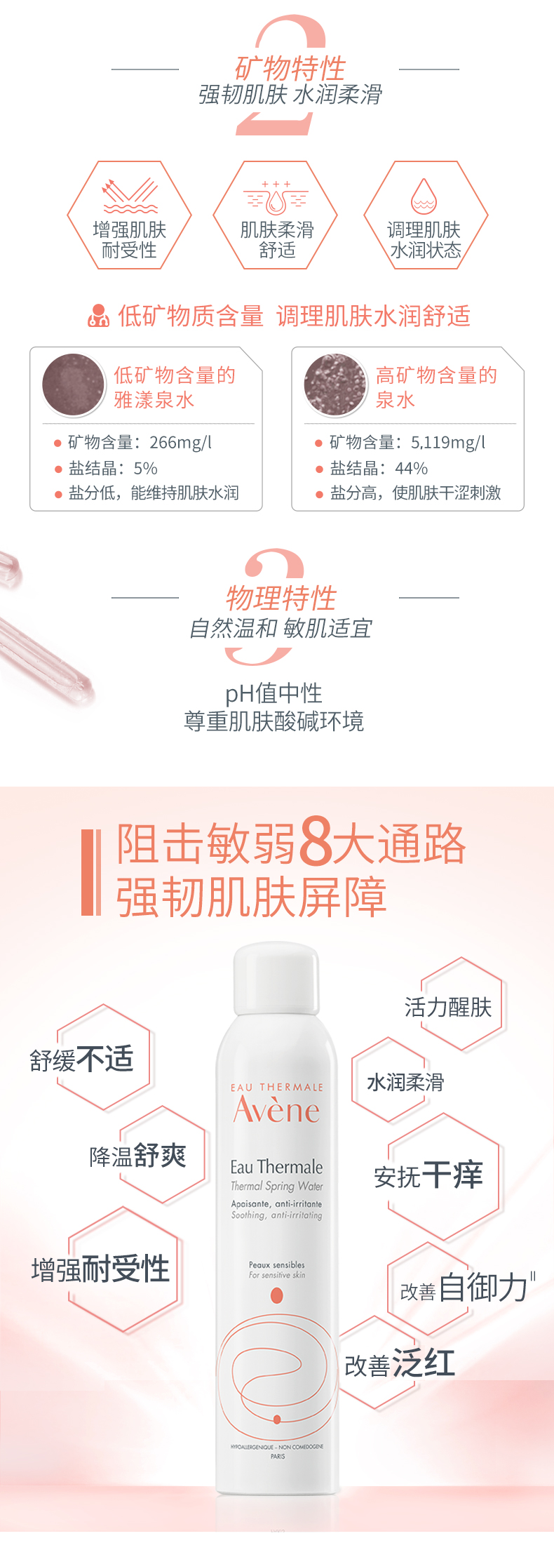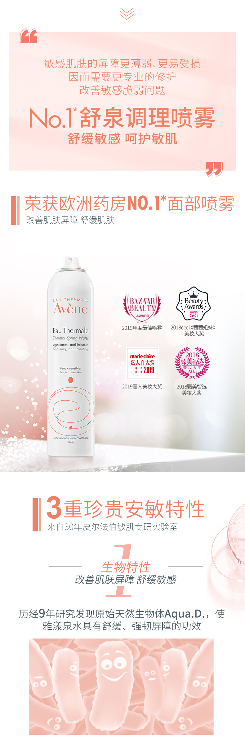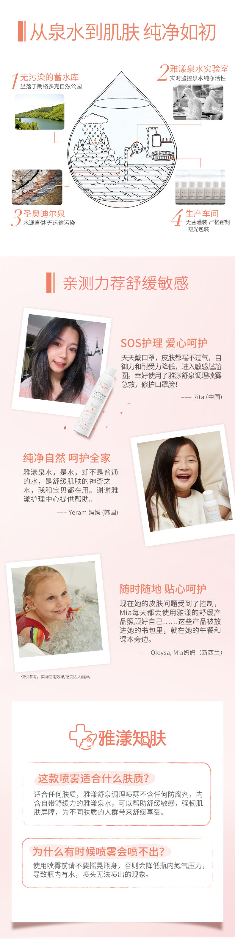 雅漾的大喷,直接从泉源取水,含肌肤所需的微量元素和二氧化硅,低矿物含量,帮助增强肌肤耐受性,降低敏感度。成人、儿童和婴儿均可使用。