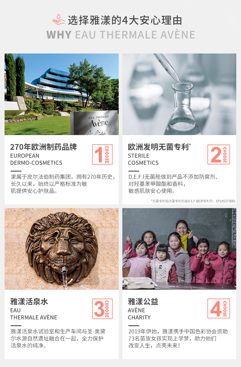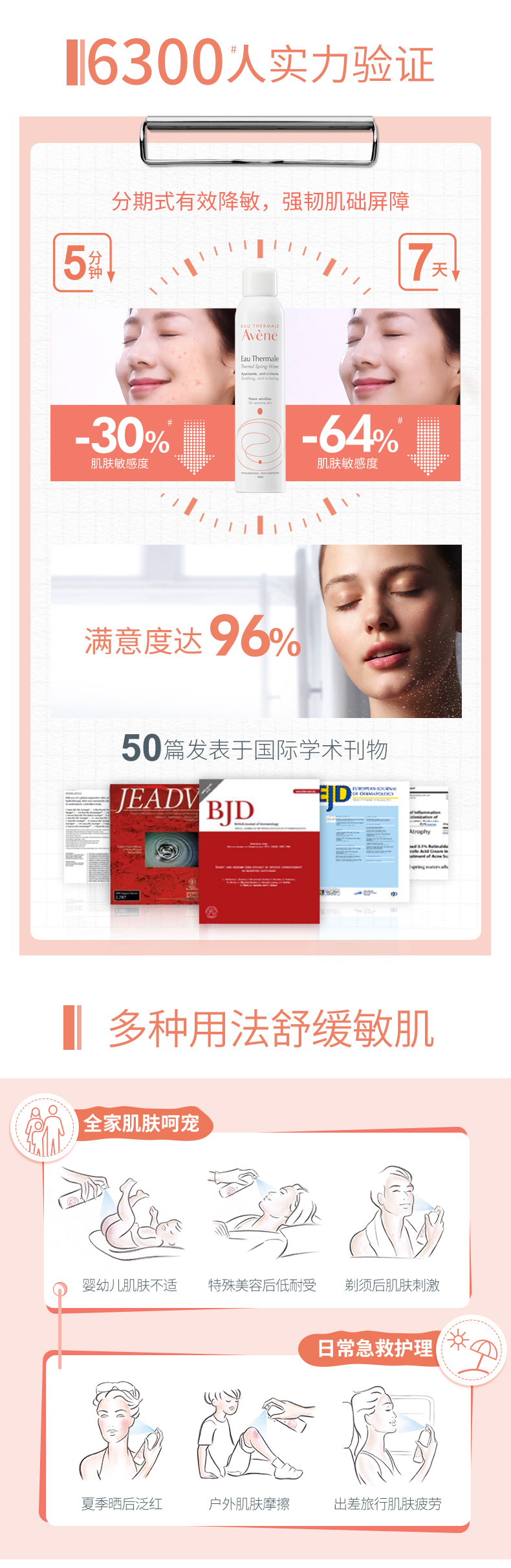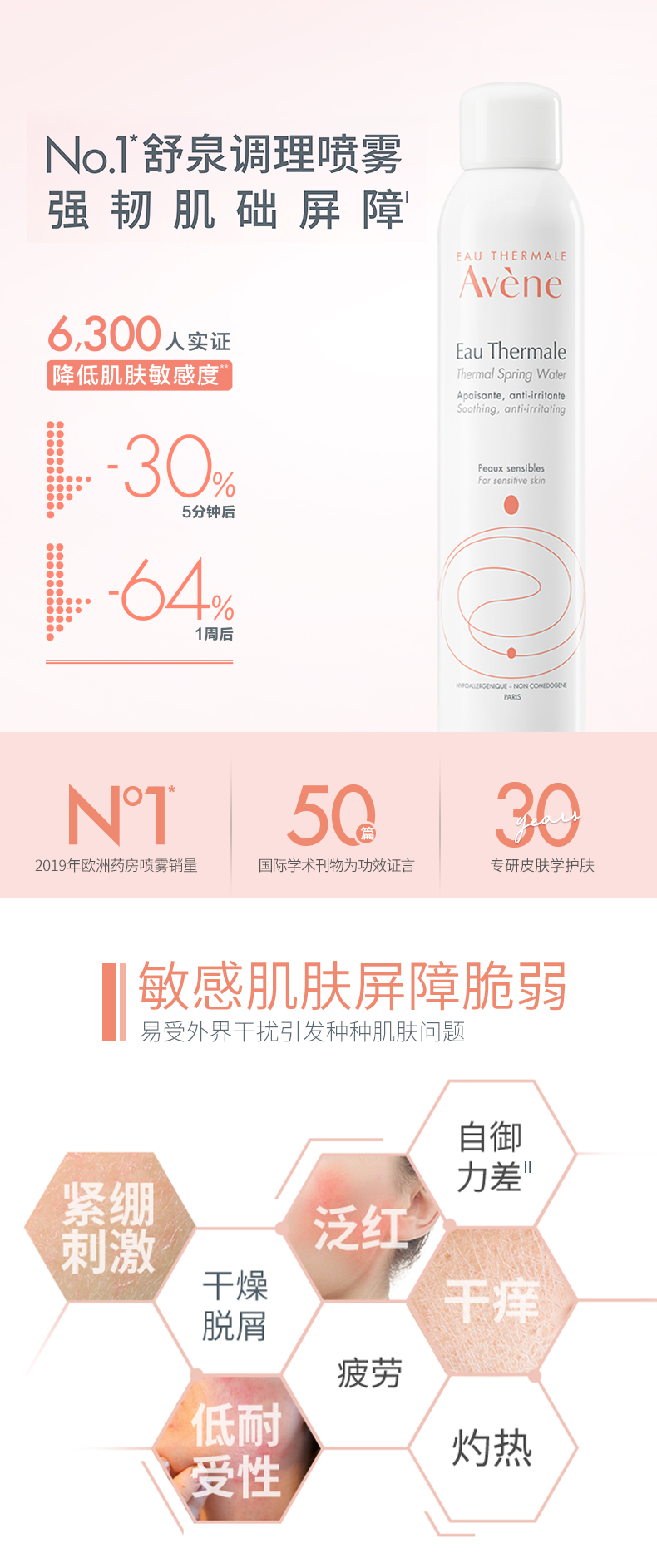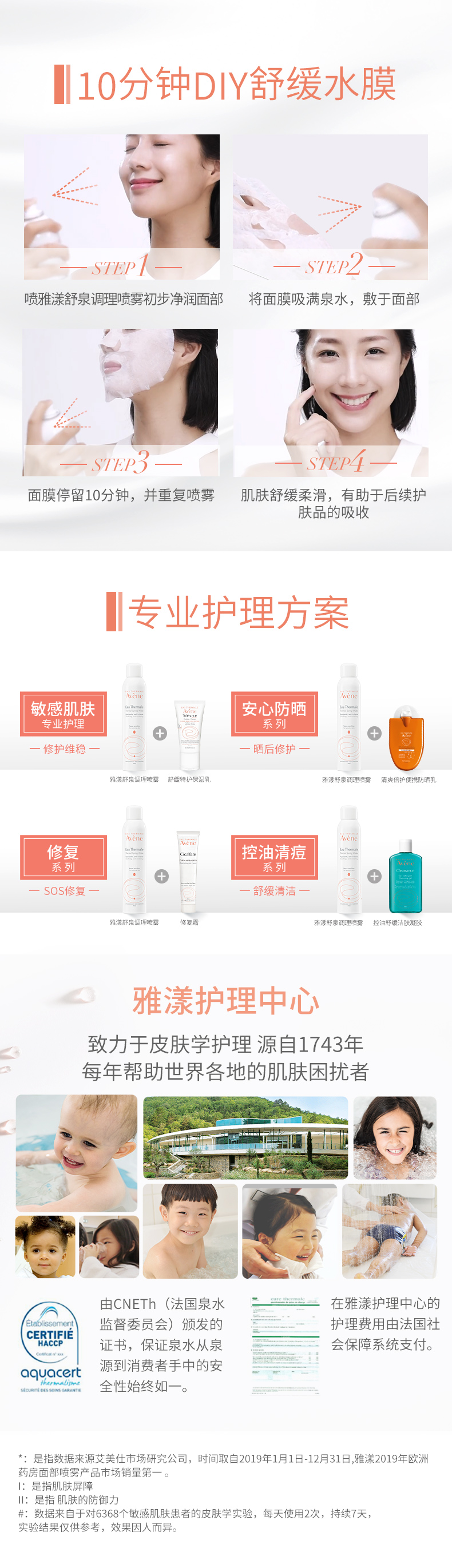雅漾的大喷,直接从泉源取水,含肌肤所需的微量元素和二氧化硅,低矿物含量,帮助增强肌肤耐受性,降低敏感度。成人、儿童和婴儿均可使用。
