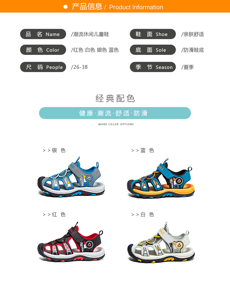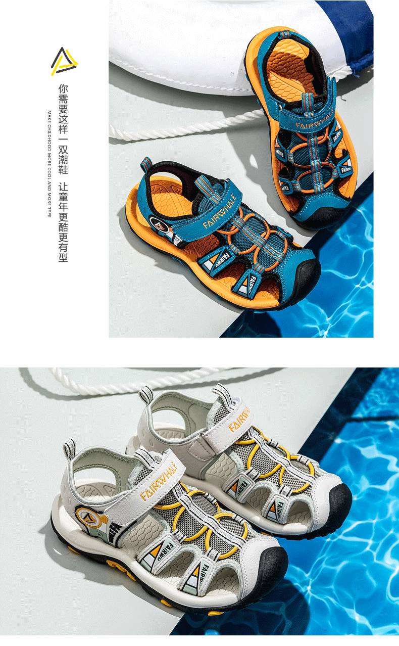 这款马克华菲儿童凉鞋,包头设计,防止宝宝脚丫受伤,时尚配色,潮流质感,简单魔术贴设计,可自由调节松紧,穿脱方便快捷,防滑鞋底,弹性减震,舒适行走。