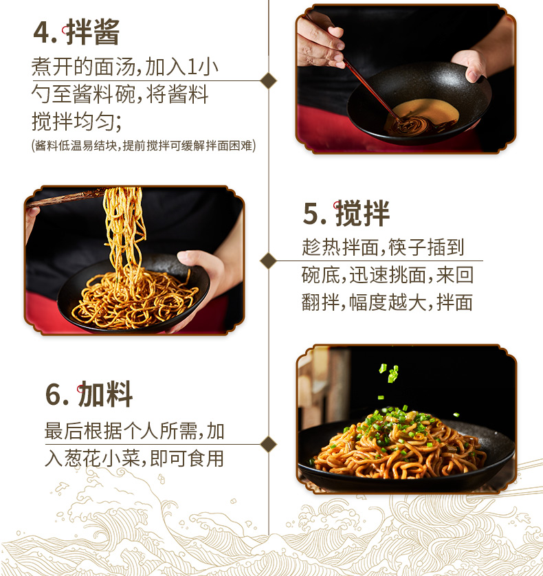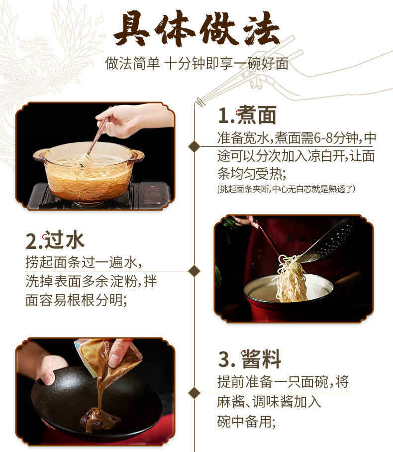 采用小麦粉、水、食用盐、植物油等食材制成。把面放在肥水里面煮4-6分分钟后,捞起加入酱料就可以吃了,跟煮挂面一样,鲜香美味,回味无穷。