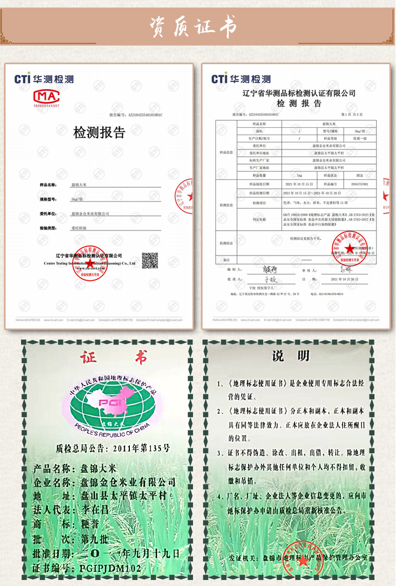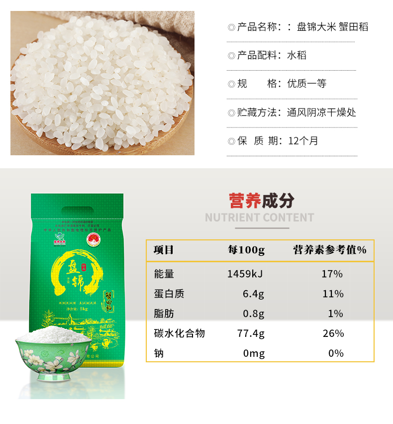 盘锦蟹田稻米,米稻田内既种稻又养蟹,形成了水稻护蟹,蟹吃虫饵,蟹粪肥田的天然食物链。所生大米粒大而圆,煮饭汁液晶莹剔透,细腻润滑,为稻米中之上乘。颗粒饱满,入口香甜。清新自然香味,口感软弹,米质精良。