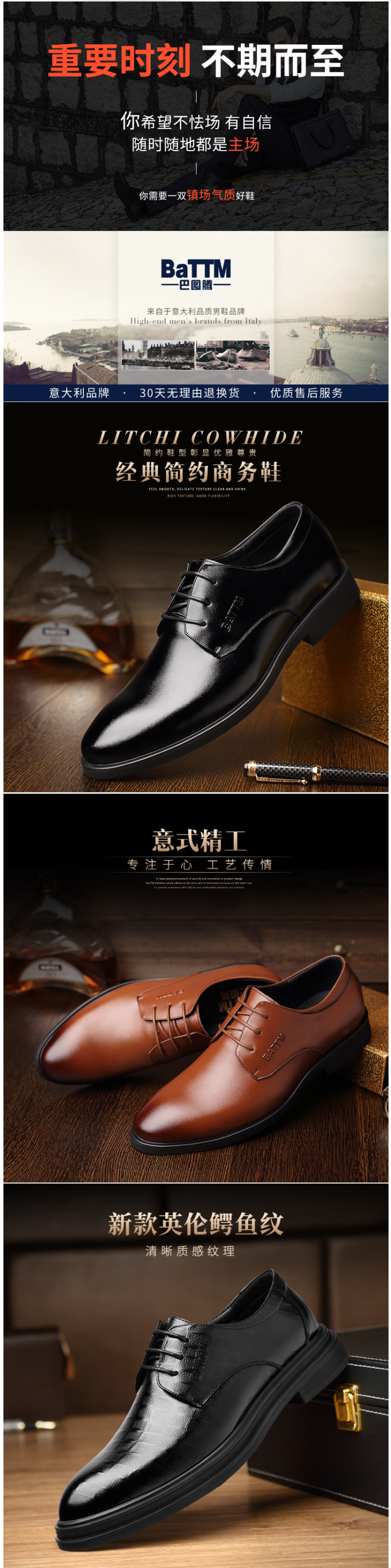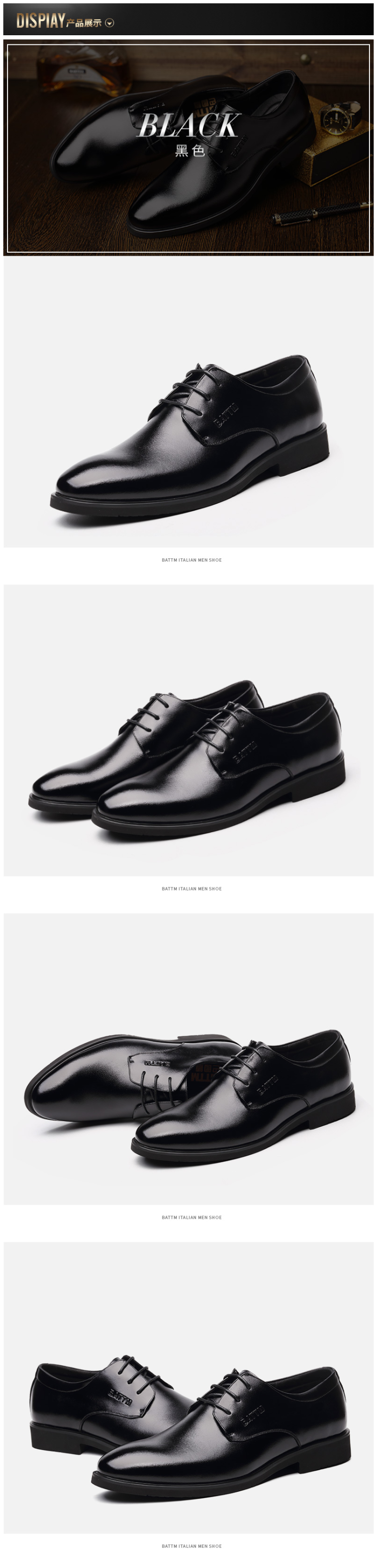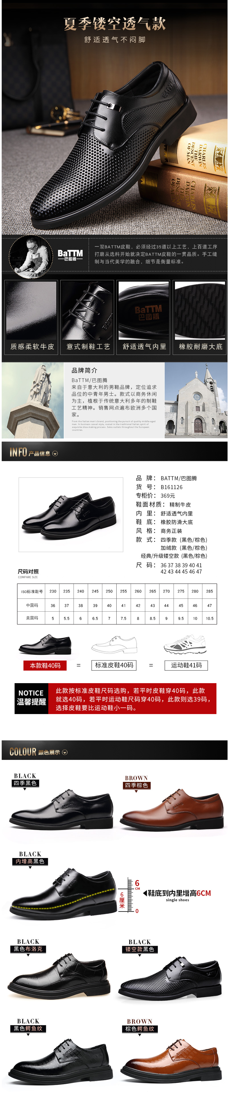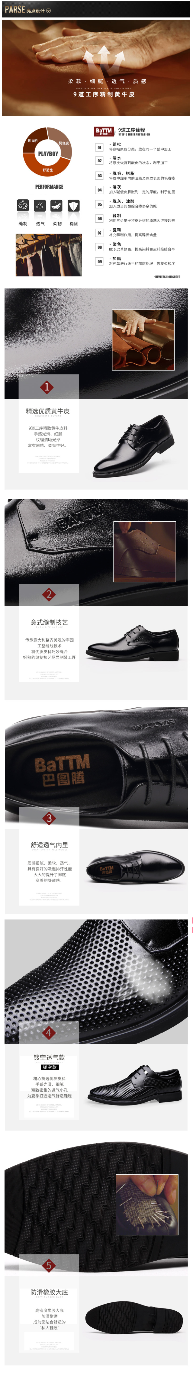 这款巴图腾 男士商务正装皮鞋,鞋面采用二层黄牛皮制成,质地柔韧,触感细腻,清晰有光泽,透气孔的表面有多个透气小孔,促进空气流通。