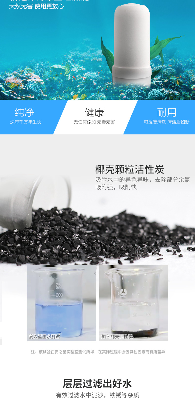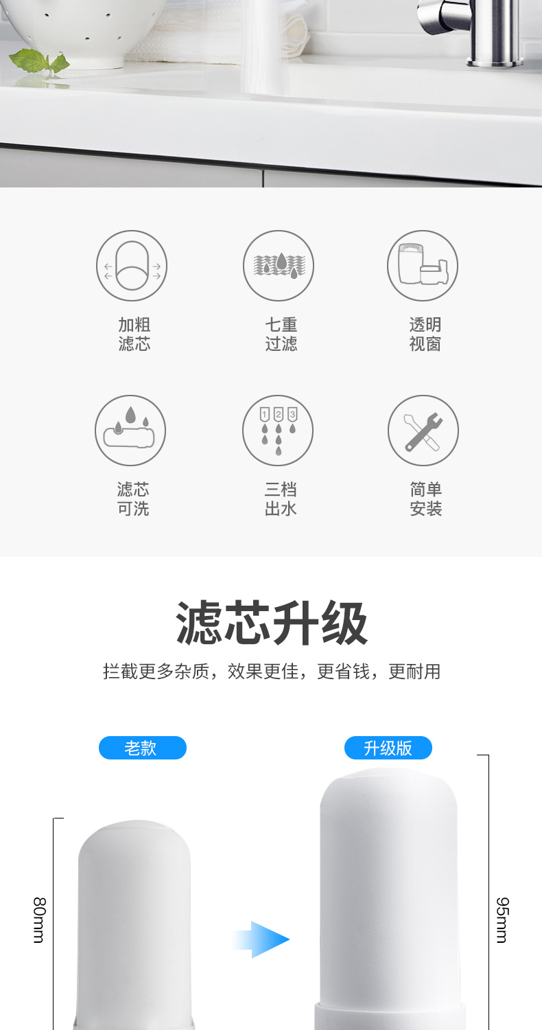 过滤精度可达到 0.1微米,有效滤除自来水中的泥沙、铁锈、胶体、余氯、异味等有害物质;带有可拆卸设计,滤芯表面脏污情况严重的话可以拿出用砂纸打磨,之后依然可以继续使用。