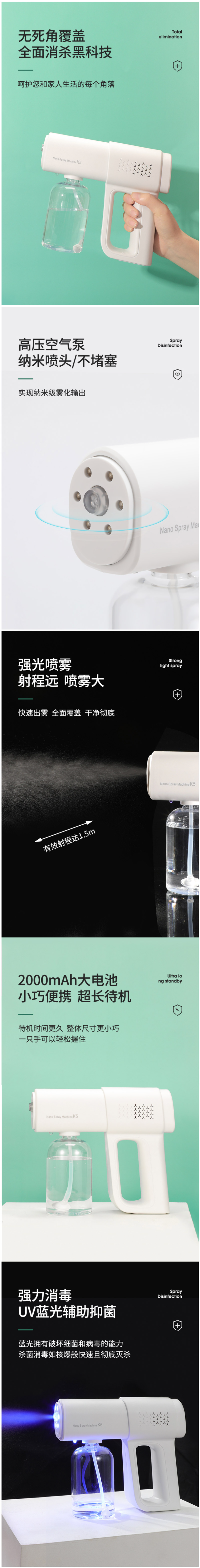 这款乐源 K5 纳米充电喷雾消毒枪,容量380ml,适配各种消毒溶液,驱蚊水等用途广泛,室内,车内,办公室,学校,电梯,杀菌除味,即喷即干,无需等待。