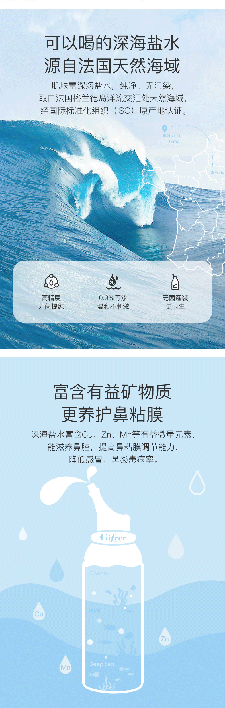 这款Gifrer生理海盐水,法国原产,主要是0.9%深海盐+无菌纯净水的配方,跟孩子的眼泪成分几乎一致,绝无任何添加,安全无副作用,0药物成分、0激素、0防腐剂、0酒精、0刺激、0化学添加、0副作用;