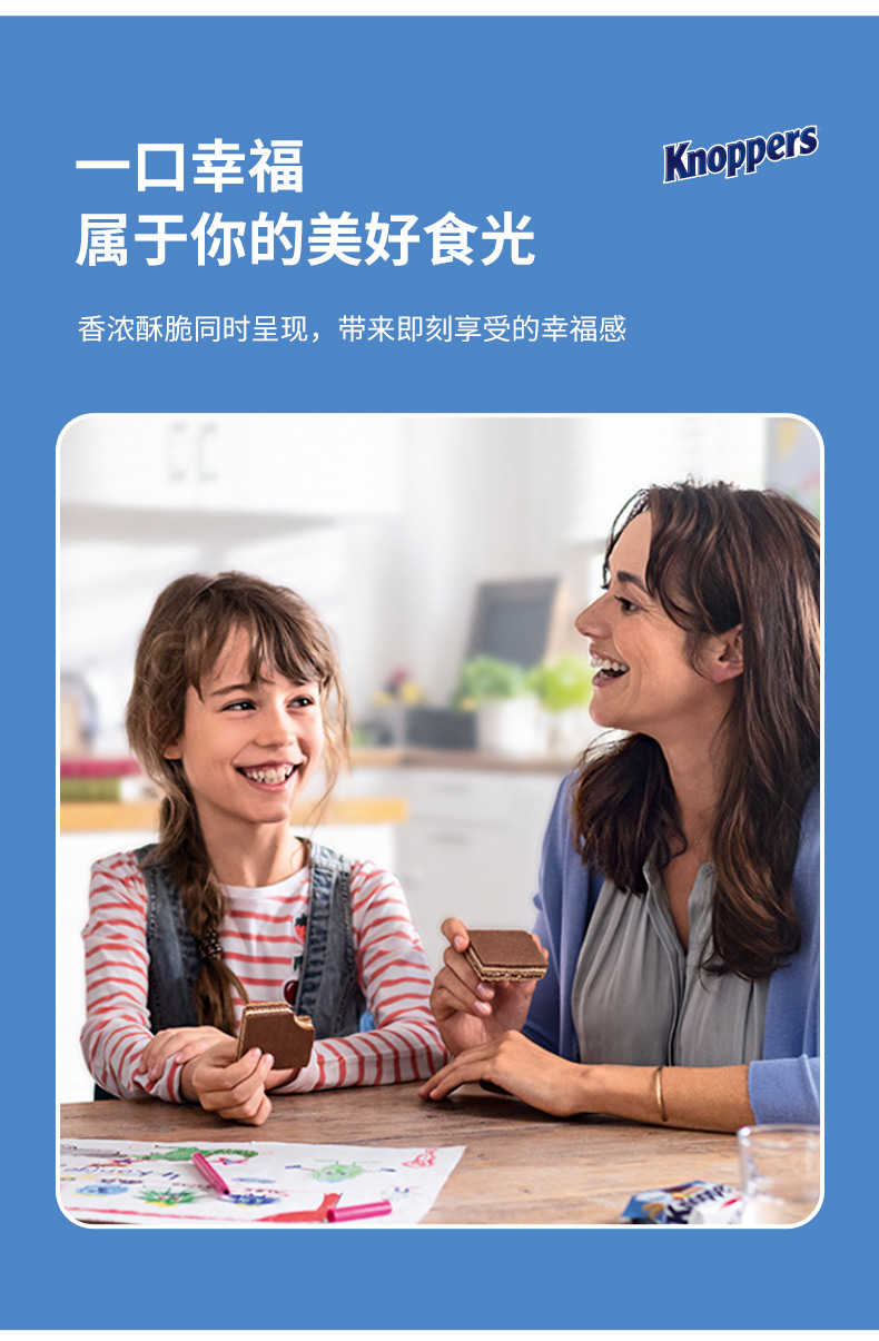 德国老牌公司August Storck KG于2015年推出Knoppers威化饼干,迅速风靡欧洲及新西兰等地,口感可媲美马卡龙,五层威化,这款是榛子椰子口味,费列罗巧克力+鲜牛奶+椰子+威化+榛仁巧克力酱+威化,营养美味健康 ---低糖、低脂肪、低卡路里,不含防腐剂。