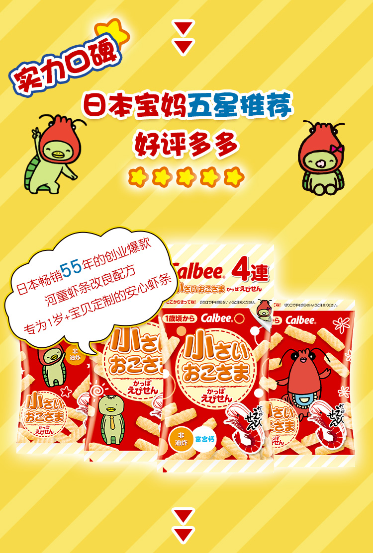这款Calbee 卡乐比 儿童虾条 ,规格:32g(4小包),整只天然海虾带壳制作,体验真正海洋的鲜美滋味,无香精,无防腐剂,非养殖虾,无虾粉, 较河童虾条相比,盐分降低25%,每袋虾条仅0.1g盐,每8g虾条含38mg钙,助力宝贝成长。