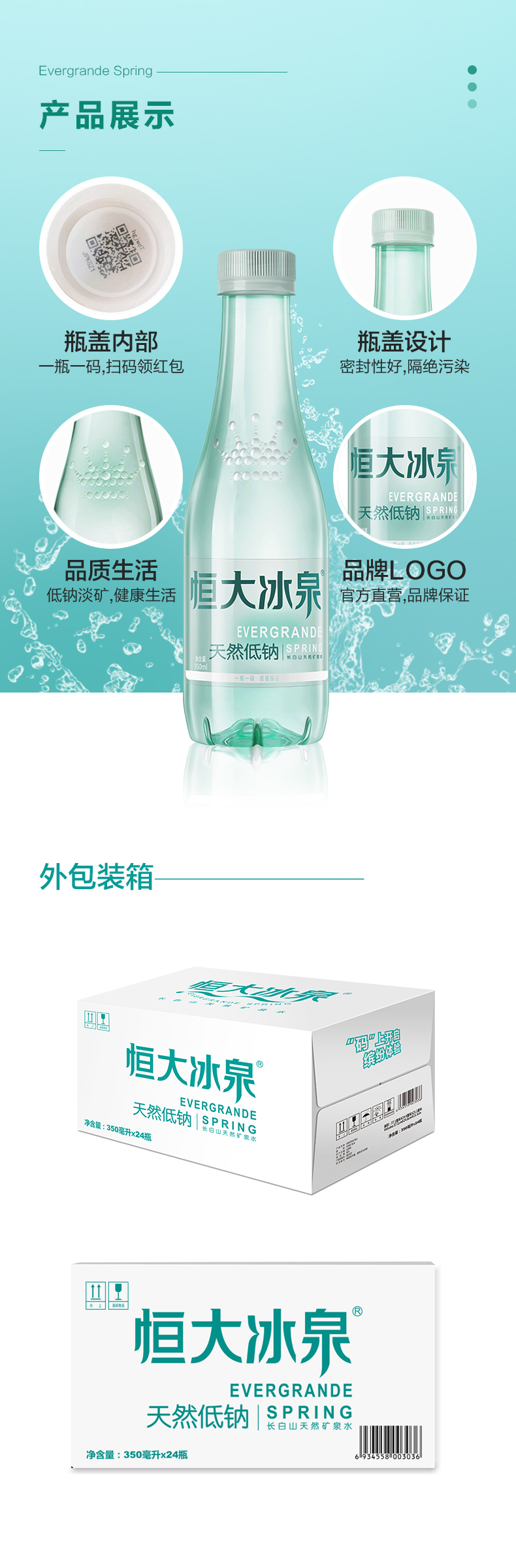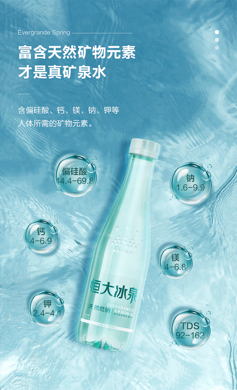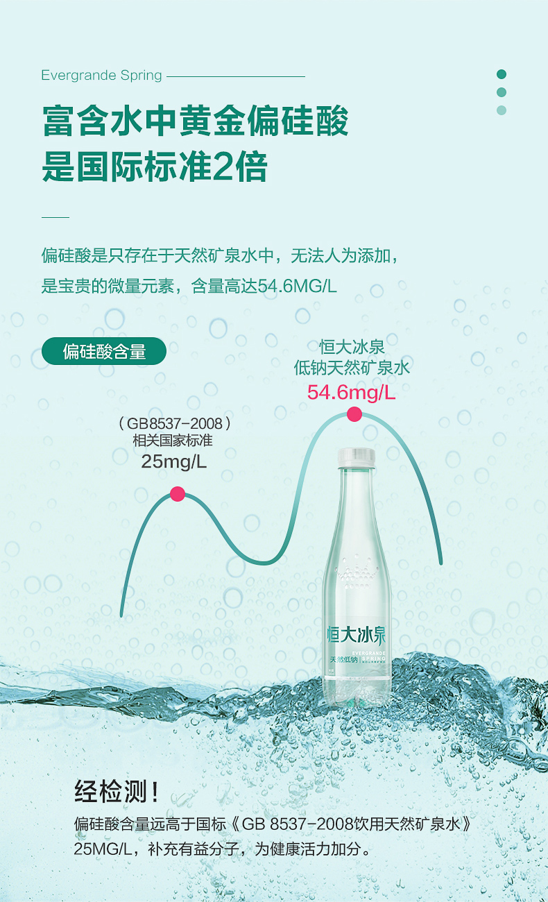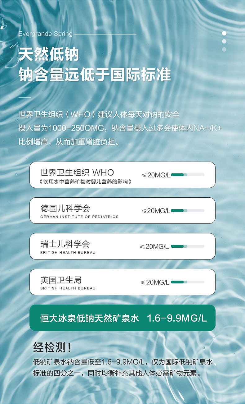 恒大冰泉经世界权威鉴定机构——德国Fresenius检测,鉴定结论为“口感和质量与世界著名品牌矿泉水相近,部分指标更优”。PH值7.02-7.98,弱碱性,更适合人体,富含丰富矿物质,健康安全。