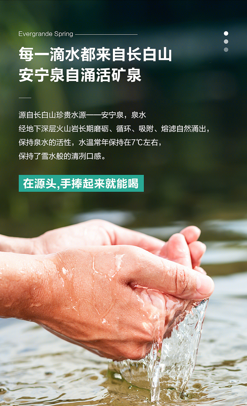 恒大冰泉的水源地为吉林省长白山深层矿泉,与欧洲阿尔卑斯山、俄罗斯高加索山一并被公认为世界三大黄金水源地。长白山深层矿泉,是经过地下千年深层火山岩磨砺,百年循环、吸附、溶滤而成,属火山岩冷泉。水温常年保持在6-8℃,水质中的矿物成分及含量相对稳定,水质纯净、零污染,口感温顺清爽。