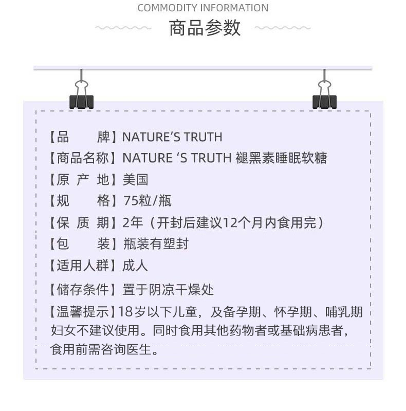 天猫国际进口超市159元,下单立减39.75元,可领10元优惠券,实付109.25元到手。这款Nature's Truth 自然之珍 退黑素睡眠软糖,规格:75粒,美国原装进口,产品通过美国UL认证、cGMP认证、USP认证等,采用科学配比,每粒含褪黑素1.5mg,茶氨酸1mg,Q弹水果味,是一种老少皆宜的非安定类安眠药,且无成瘾性,特别适合时差党和睡眠质量差的人群。