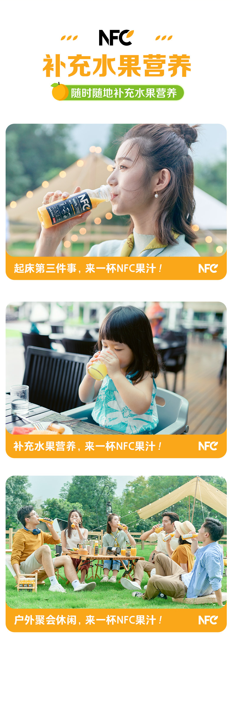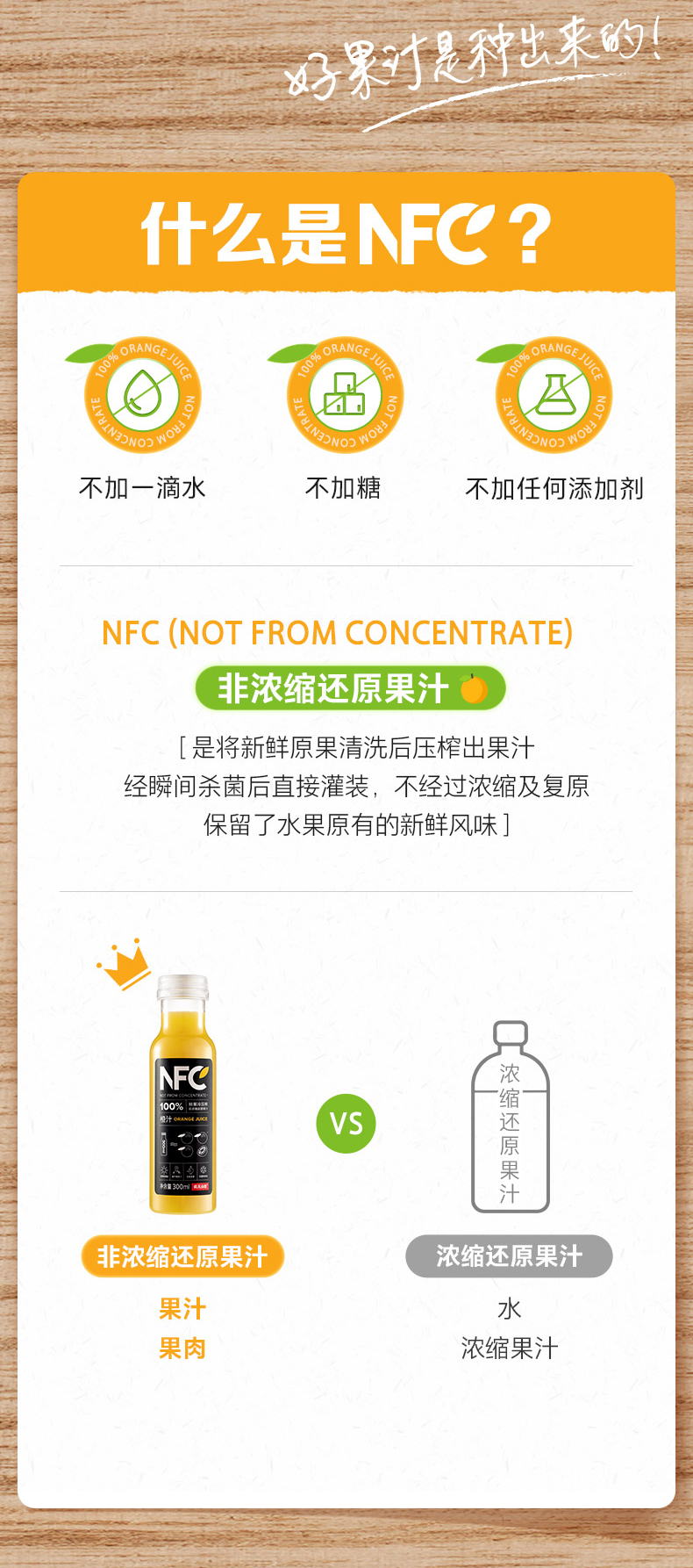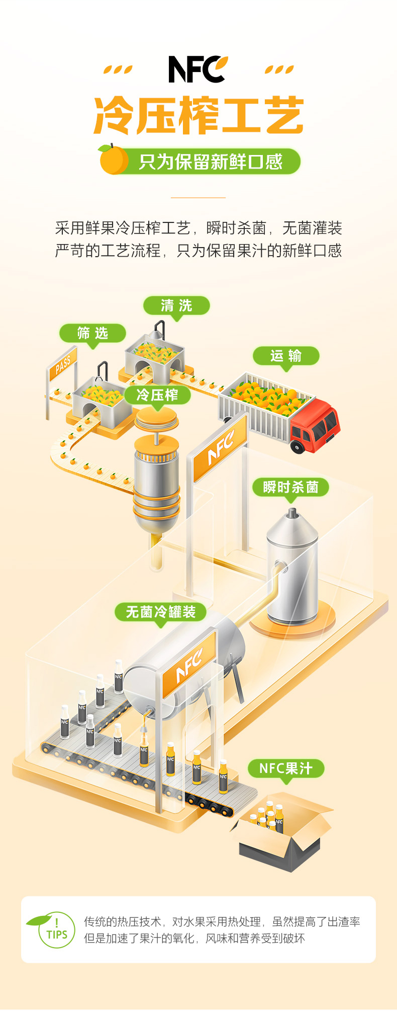 NFC果汁(Not From Concentrate,即非浓缩还原汁),就是将新鲜原果清洗后采用集汁管取汁的先进工艺,经瞬间杀菌后直接灌装,在低温环境中加工而成不经浓缩复原,最大限度保留了水果原有的新鲜风味和营养。