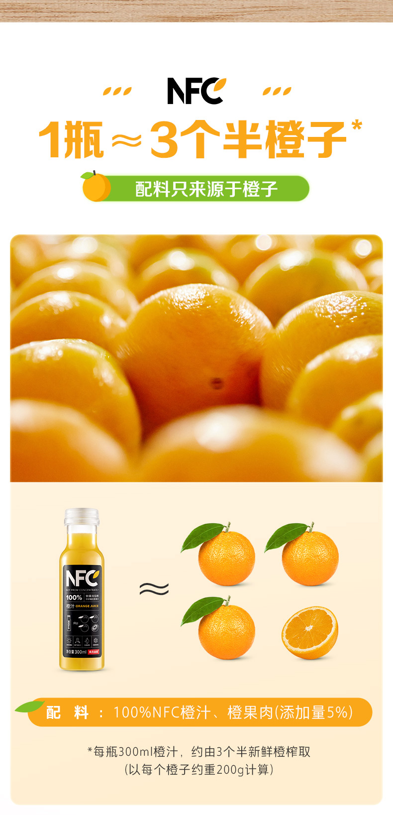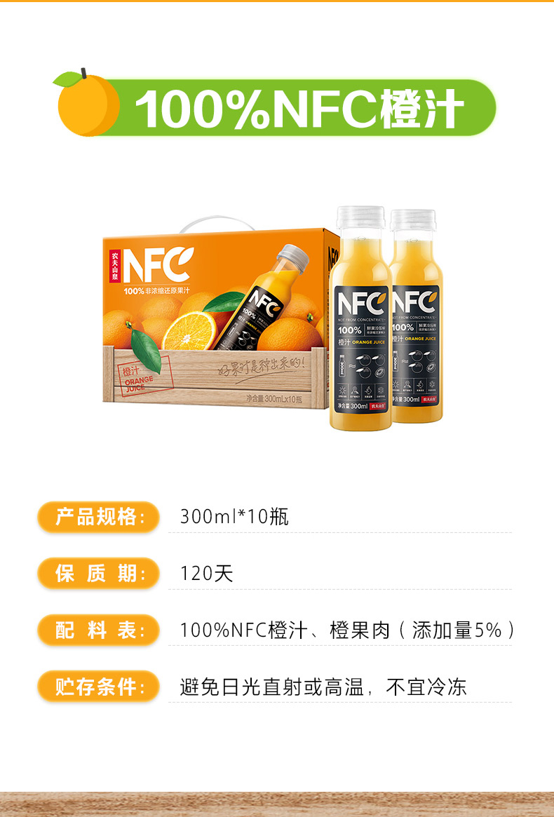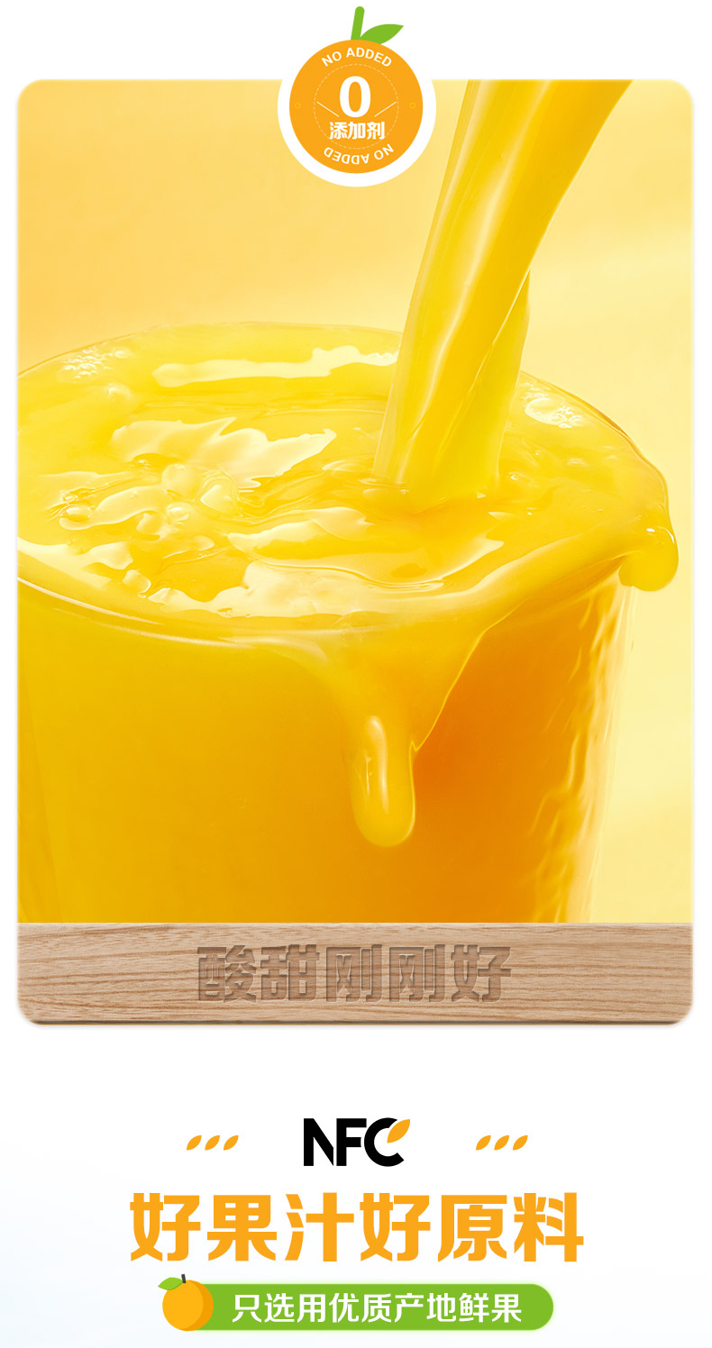 农夫山泉 100%NFC 鲜果冷压榨纯果汁,精选当季新鲜水果,然后低温冷榨,拒绝高温浓缩和兑水还原,生产过程中不加水、不加糖、不加防腐剂、香精、甜味剂这些添加剂。口感清甜不腻,还含有很多果肉。果汁中富含天然维生素C、叶酸、膳食纤维及果胶。
