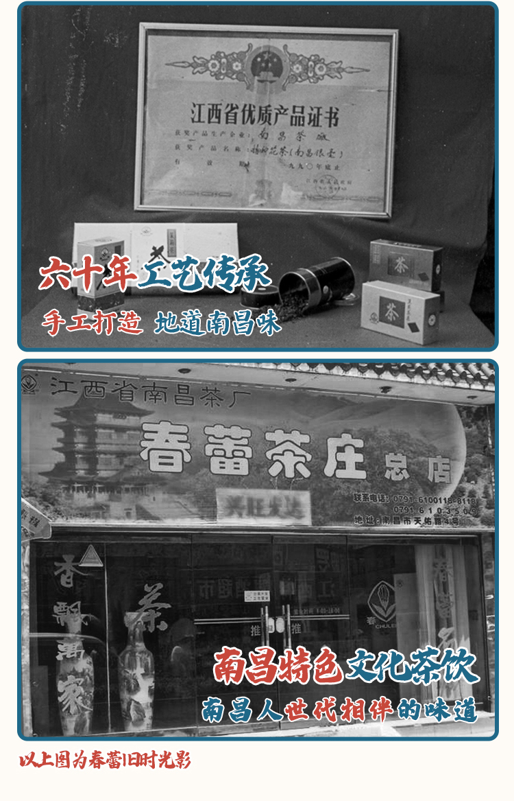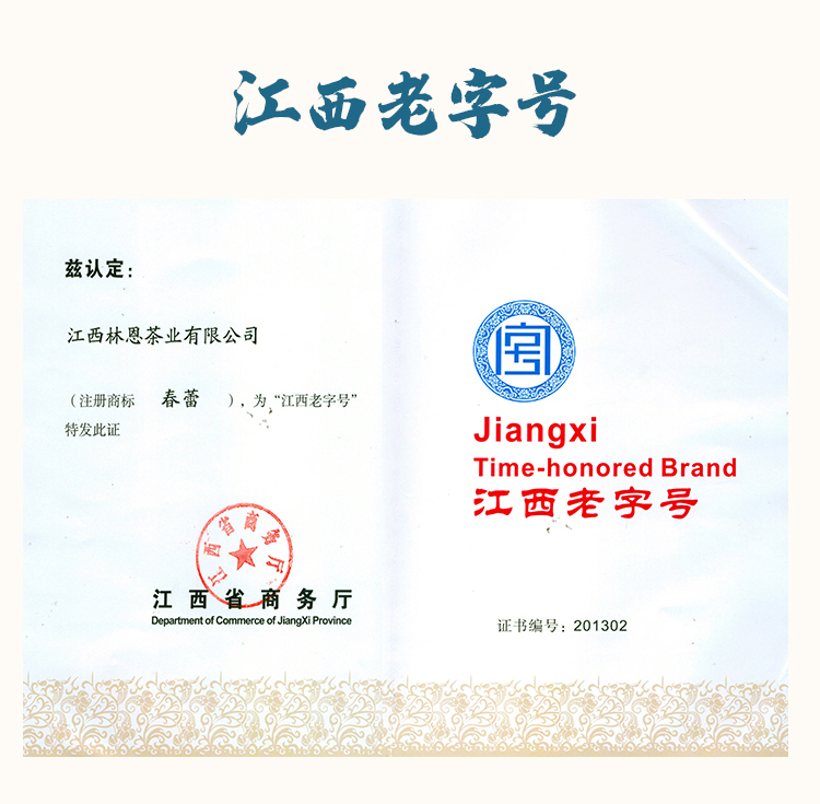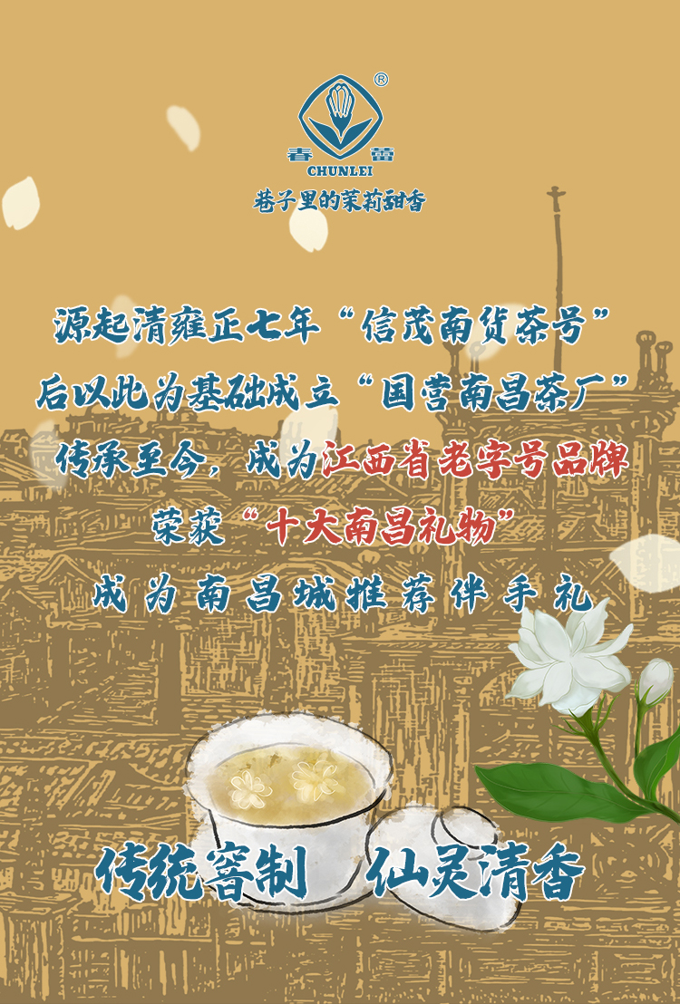「春蕾」源自清雍正七年,徽商在昌创办“信茂南货茶号”,光绪三十四年,南昌知府徐嘉禾将茶号自制的茉莉花茶进贡给光绪皇帝品尝,获得御赐金牌,一时传为美谈,在南昌的老字号中是非常古老的一家,1952年公私合营,成立了国营南昌茶厂“春蕾”品牌由此孕育而生。