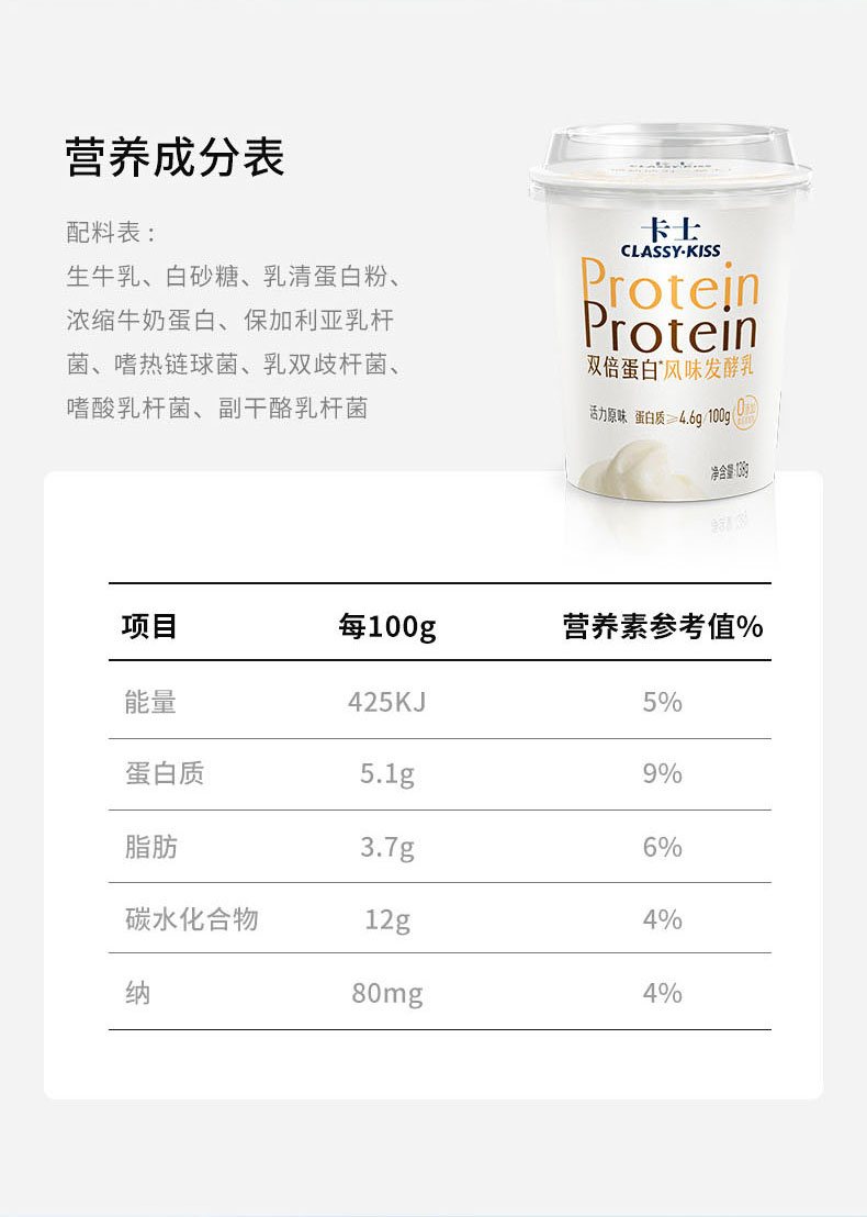 卡士品牌定位为高端酸奶,HACCP+ISO9001双质量体系认证,双倍高品质蛋白,甄选高品质生牛奶,引进欧洲优质益生菌菌种以及发酵工艺(保加利亚乳杆菌、嗜热链球菌、乳双歧杆菌、嗜酸乳杆菌、副干酪乳杆菌 5种活性益生菌)。0食品添加剂,均衡肠道状态,促进肠道蠕动、营养易吸收。